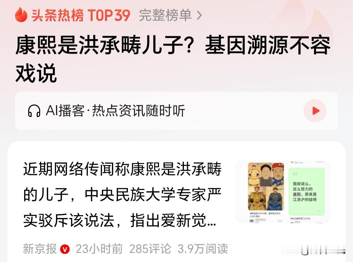 大家本来就当个乐子,看把这些无良媒体和所谓的“专家”急的,好像是自家祖坟被刨了一样。 不管康熙是不是洪承畴的儿子,都不会改变康雍乾对中华民族的伤害,三人在位期间发起了170多次的“文字狱”。 具体有多少人被杀先不说,就说被销毁的古籍文献就数不胜数,三人在位期间,销毁古籍文献超过15万册,有1000万份明史档案被毁,各朝各代流传下来的8万片印刷刻板被毁。 结果就是我们现在读到的很多历史都是清朝伪造的,清朝对中华文明造成了严重的毁坏。 如果康熙是洪承畴的儿子,那他的罪孽更深重。