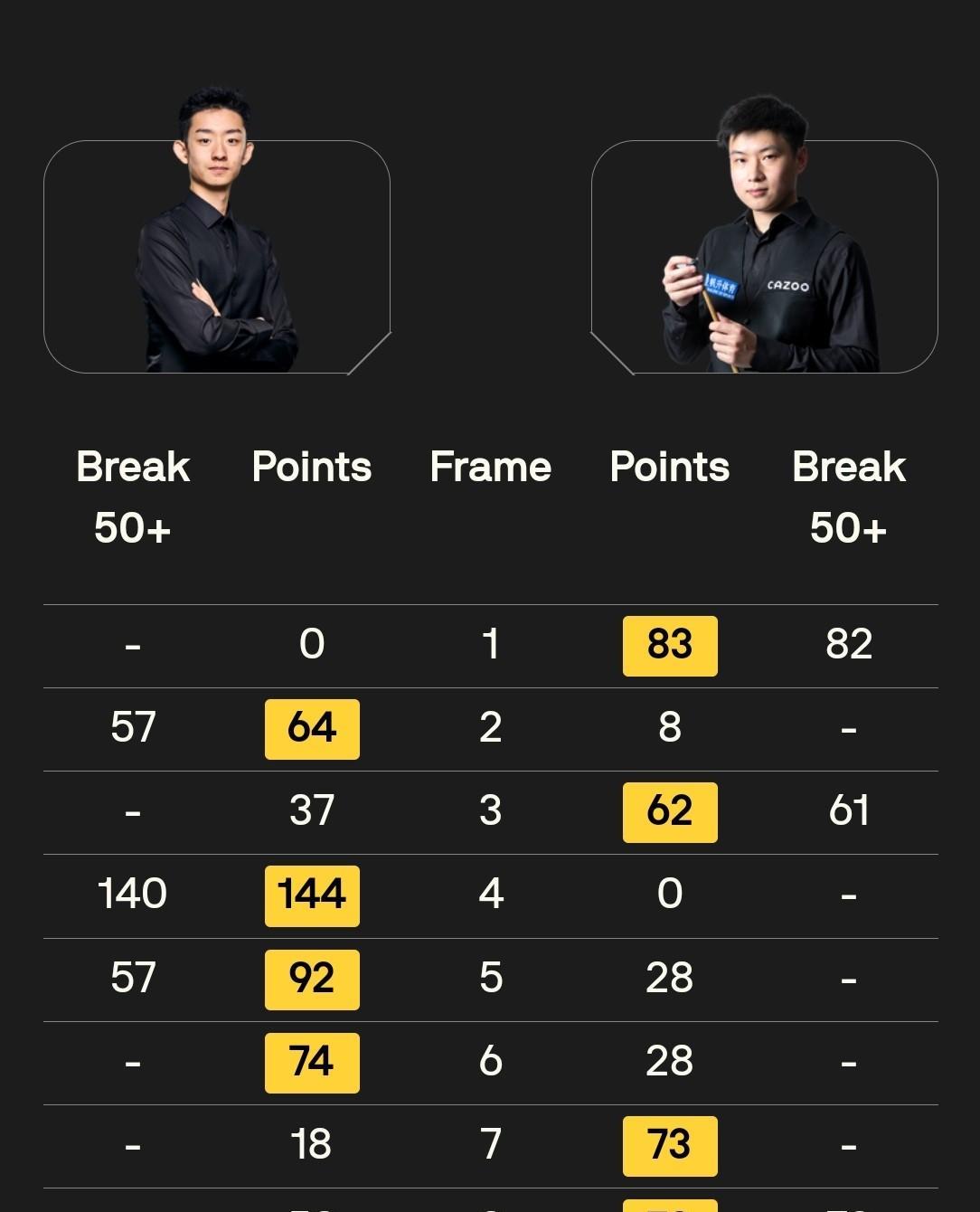 赵公子上半场打得稀碎,数次简单球失误加各种防守漏球,居然还能紧咬住比分。整体来看吴宜泽打得更合理和果断,该把握住的机会都兑现了,如果下半场能继续保持专注,赵公子想赢会很难。 两人上半场共打出一杆破百,5杆50+,几乎没有什么太多的防守环节,节奏还是挺快的。下半场如果还是这个方式进行下去,现场的观众还真是可以大饱眼福了。