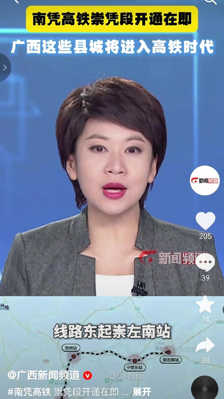近期南凭高铁崇凭段即将开通,南凭高铁崇凭段正线全长81.52公里,设计时速250公里,线路东起崇左南站,途经宁明县、龙州县,终到凭祥市凭祥东站。目前该路段已进入满图试运行阶段,新建的龙州站、宁明东站等车站各项收尾工作正在加快推进,开通进入倒计时。(来源于@广西新闻频道 )