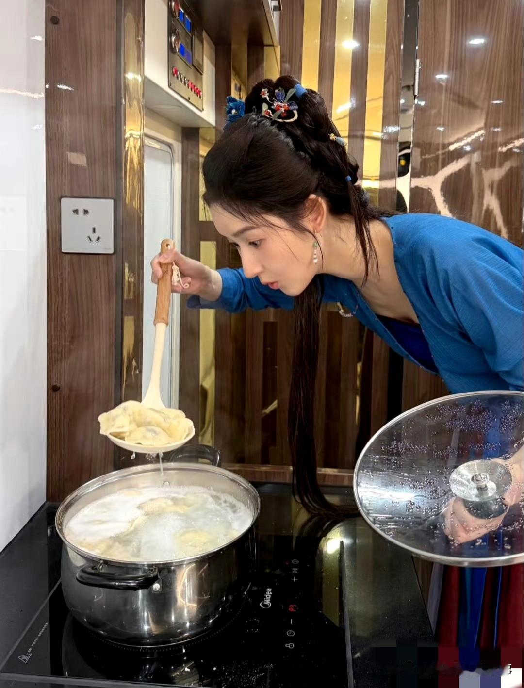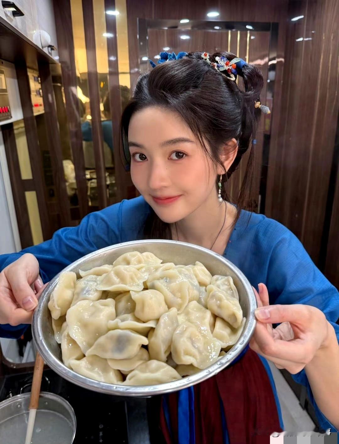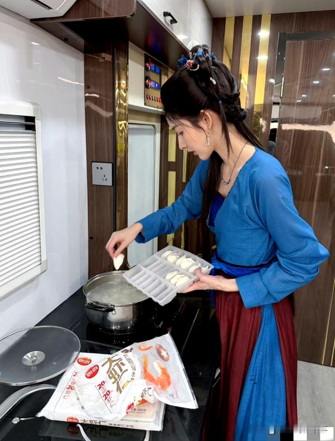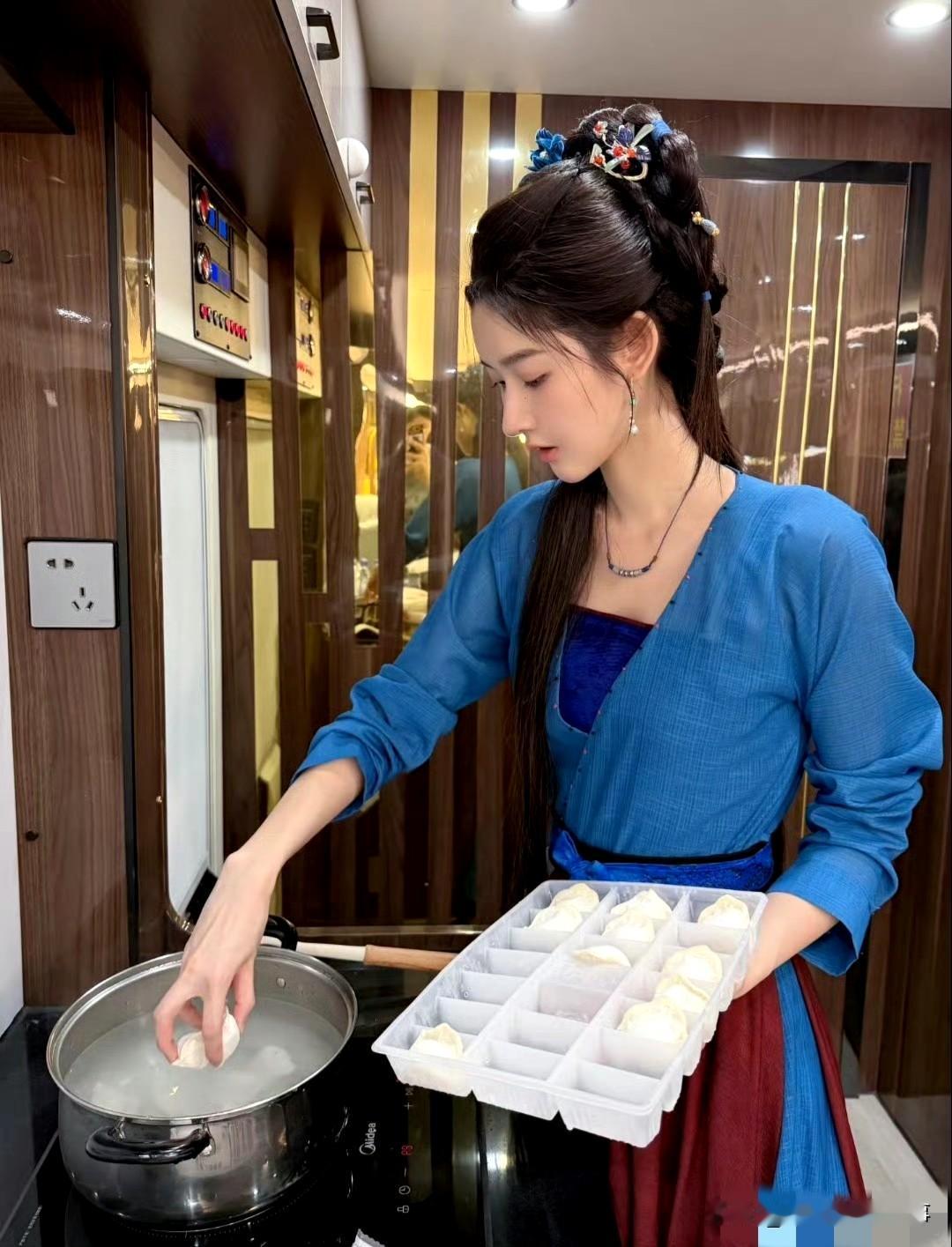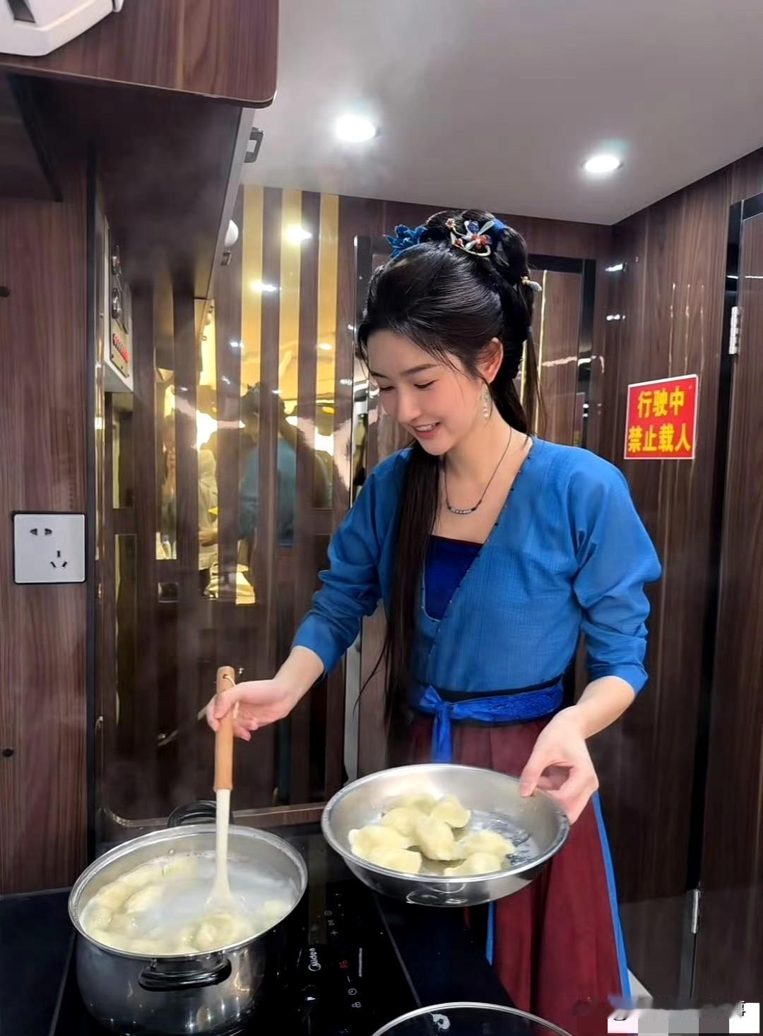 王玉雯立冬穿古装煮饺子:这波“古人干饭”太会整活! 谁懂王玉雯这波立冬整活?穿一身蓝红古装扎着精致发簪,在房车厨房煮起了虾仁水饺,下锅、盛盘、淋油一气呵成,举着满碗饺子笑出甜牙,配文连喊“我爱饺子”直接把吃货属性焊死。 古装+现代厨房的反差感,加上立冬吃饺的仪式感,这波营业又甜又接地气,谁看了不想跟着来碗热乎的!