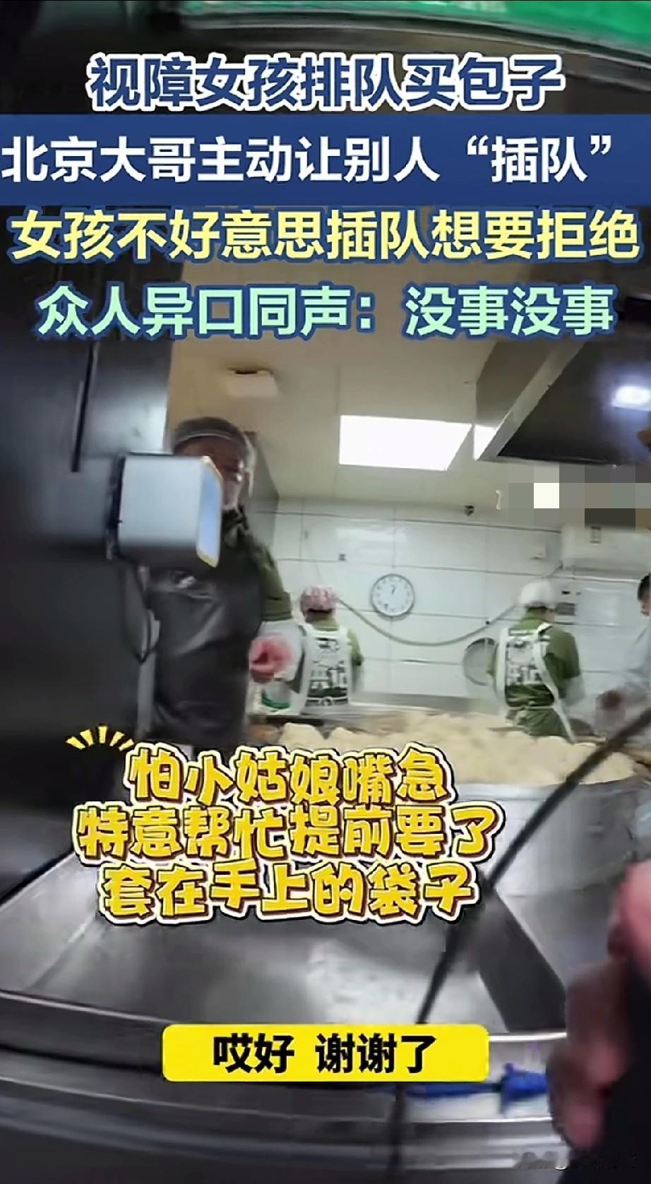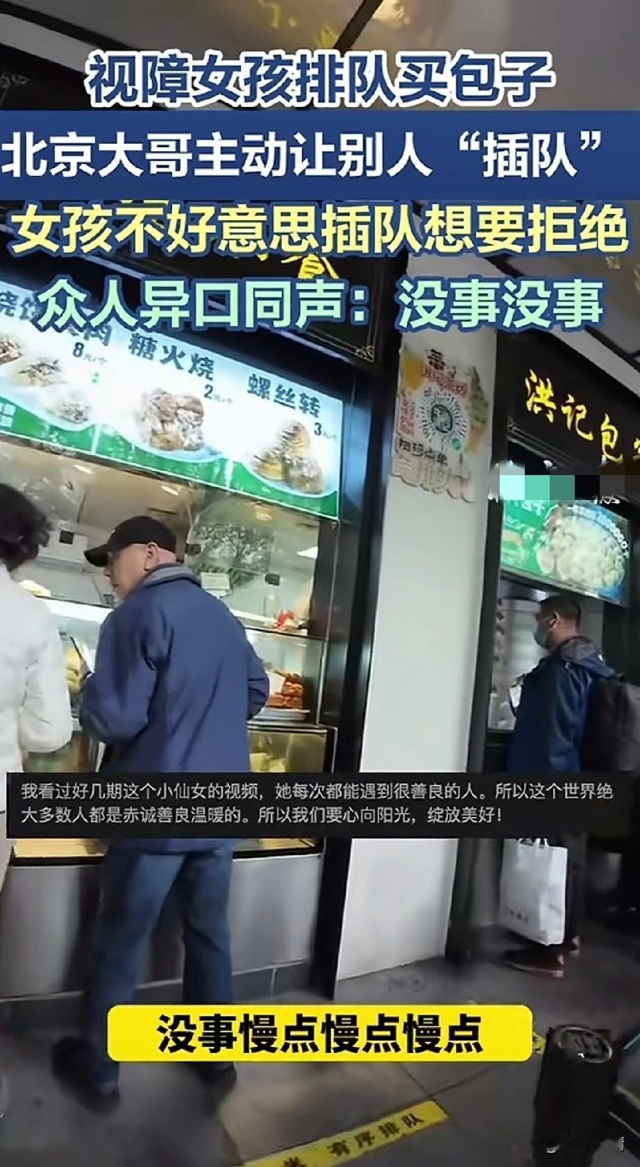 视障女孩在北京排队买包子, 北京大哥直接让她插队, 女孩不好意思怎么做, 大哥直言没事你插队吧! 周围人群都同意女孩插队, 女孩感动不已! 看女孩不好意思, 大哥让女孩站着也行, 一会到了就叫你, 不一会大哥到了, 就女孩先买了, 卖包子大姐还特意给了女孩一个袋子, 提醒包子热,让她小心一点! 可以看出大家对于残疾人都是愿意帮助的,还是好人多呀! 大家对于北京大哥让视力障碍女孩插队买包子怎么看? 北京身边事 插队排队 墨镜插队 北京露天排队 北京盲人阿姨