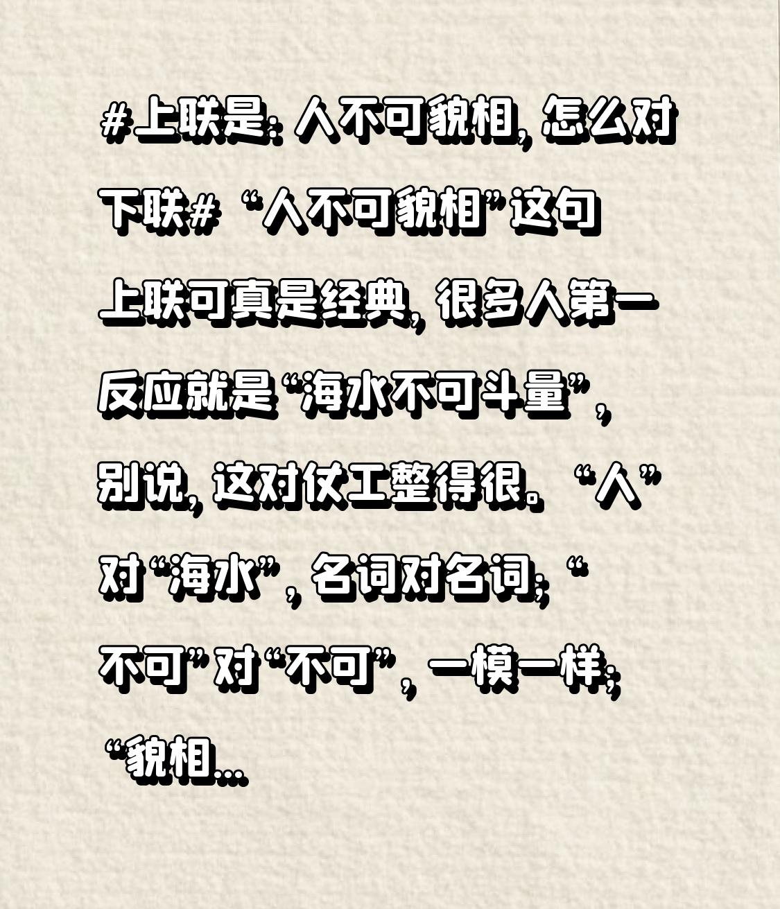 “人不可貌相”这句上联可真是经典,很多人第一反应就是“海水不可斗量”,别说,这对仗工整得很。“人”对“海水”,名词对名词;“不可”对“不可”,一模一样;“貌相”对“斗量”,都是动宾结构。而且二者意境一致,都在说不能以表面现象判断本质。 不过也有人对出“事须用心看”,简洁明了,强调判断人或事不能只看表面,得用心体会。要是想更有文化韵味,“物自有深藏”也不错。但我觉得还是“人不可貌相,海水不可斗量”最经典,老祖宗留下来的智慧,很难超越!