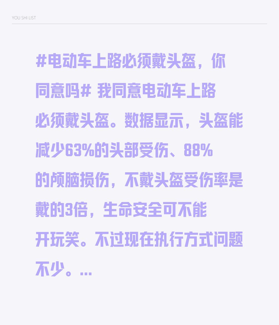 我同意电动车上路必须戴头盔。数据显示,头盔能减少63%的头部受伤、88%的颅脑损伤,不戴头盔受伤率是戴的3倍,生命安全可不能开玩笑。 不过现在执行方式问题不少。各地标准不统一,浙江2020年就开始管,汉中明确要求戴且罚款,无锡有防篡改技术标准,老百姓都迷糊了。而且执法方式粗暴,就知道罚款,头盔质量还参差不齐,便宜的可能起反作用。 国家得统一标准,执法也得更人性化,多宣传教育、少罚款,免费给困难群体发基础头盔、设借用点,还要严把质量关,让戴头盔真正保障安全。