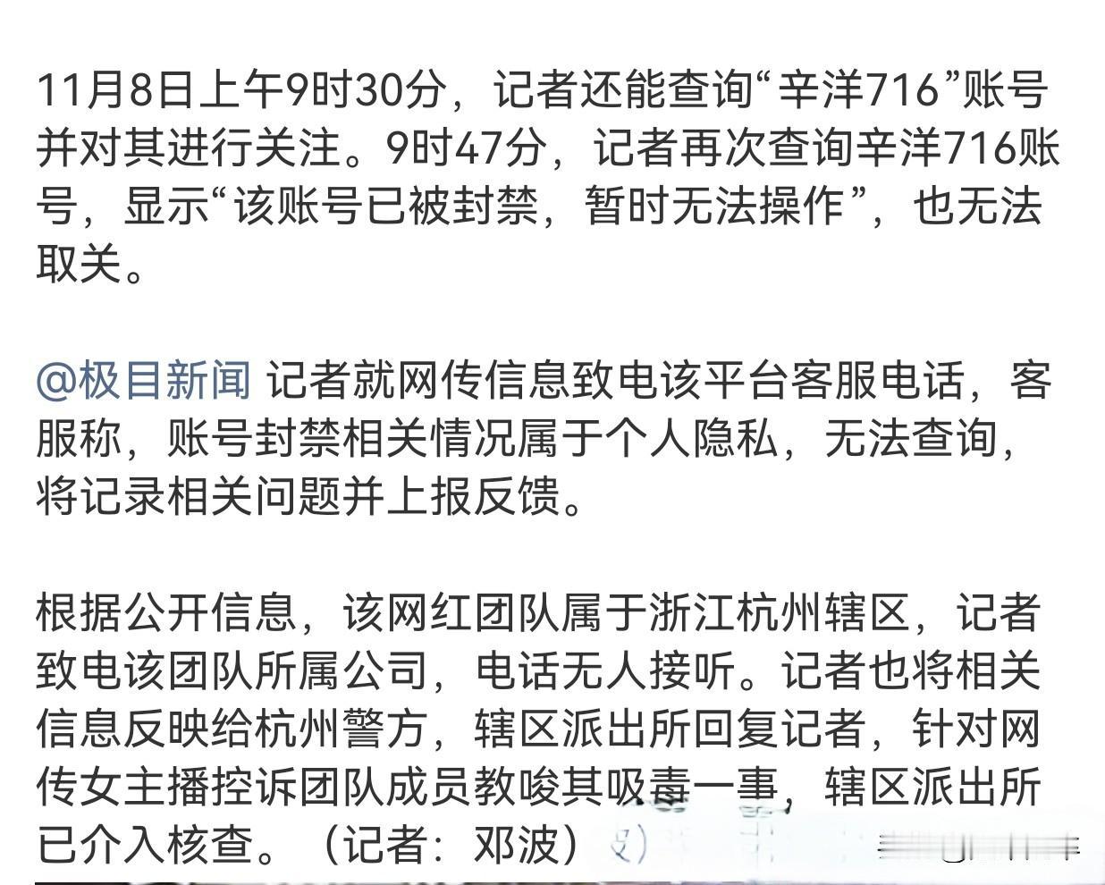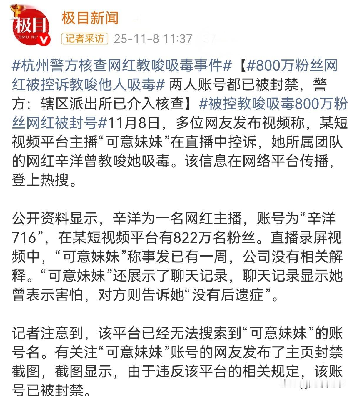 杭州警方正在核查网红教唆吸毒😱😱😱 800万粉丝网红被控诉教唆他人吸毒。 举报人短视频主播可意妹妹(原账号50万粉丝),是网红团队辛洋716成员。被指控者团队负责人辛洋(账号“辛洋716”,封禁前粉丝822万)。 可意发视频控诉辛洋于25年10月26日凌晨以师徒关系施压,教唆可意吸食疑似毒品的电子烟,辛洋声称没有后遗症,麻麻的很舒服。可意多次拒绝后,辛洋质问“你害怕啥?不玩就是不拿我当师傅”,并胁迫其前往住所。可意称事发后向公司求助未获回应,被迫于11月8日凌晨直播曝光,中途被平台强制下播。可意在直播时展示聊天记录、录音(内容提及诱导过程以及事发已一周但获公司未回应)。 辛洋直播团队隶属杭州某MCN机构,团队包括“小妮·辛洋”“冠冠·辛洋”等成员(部分账号已封禁)。目前“可意妹妹”账号因“违反平台规定”于11月8日凌晨封禁。辛洋账号“辛洋716”于同日9:47被封禁。杭州辖区派出所于11月8日回应已针对教唆吸毒指控介入核查。 现在争议的问题就是可意描述涉毒物为(疑似内含合成大麻素的“上头电子烟”),但警方未公布检测结果。也有支持辛洋的网友辩称“仅含合成药物,非毒品”。 现在等待警方核查当事人生物样本、电子烟残留物及聊天记录真伪结果。教唆吸毒绝非流量炒作,而是触碰法律红线的严重行为根据《刑法》第353条,此类行为可处三年以下有期徒刑,情节严重者更将面临三年以上七年有期徒刑。MCN公司若隐瞒或包庇,可能承担连带责任。 如今部分网红敢于肆无忌惮,背后是“追逐流量变现”的逻辑在驱动。需要对这些网红来一次严打,太多价值观严重扭曲,这个事件平台与MCN也脱不了干系。