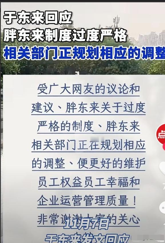 胖东来终于受不了网友的谴责,计划改革制度了! 实际上,网友反对的仅仅是公司严格的规章制度吗?是没有给任何赔偿,法院也判定员工败诉,这才是问题的根本! 开除可以,但是要给补偿!开除是公司的权利,补偿是法律,也是道德!于东来,是一虚伪的人,口口声声把员工当家人,人家员工,只犯了一点点小错误,就开除一个12年员工,而且没补偿,这就没天理! 服务好顾客目的是为了赚钱,开除老员工目的也是为了省钱!开除员工是企业的权利,除非造成重大过错损失,否则开除员工必须给予补偿,忙于职责忽视了接待客人,不属于重大过错! 于东来由过去的“民营企业家”,变成了现在的“资本家”。并且正逐渐把过去给的“荣誉”,透支的“干干净净”。