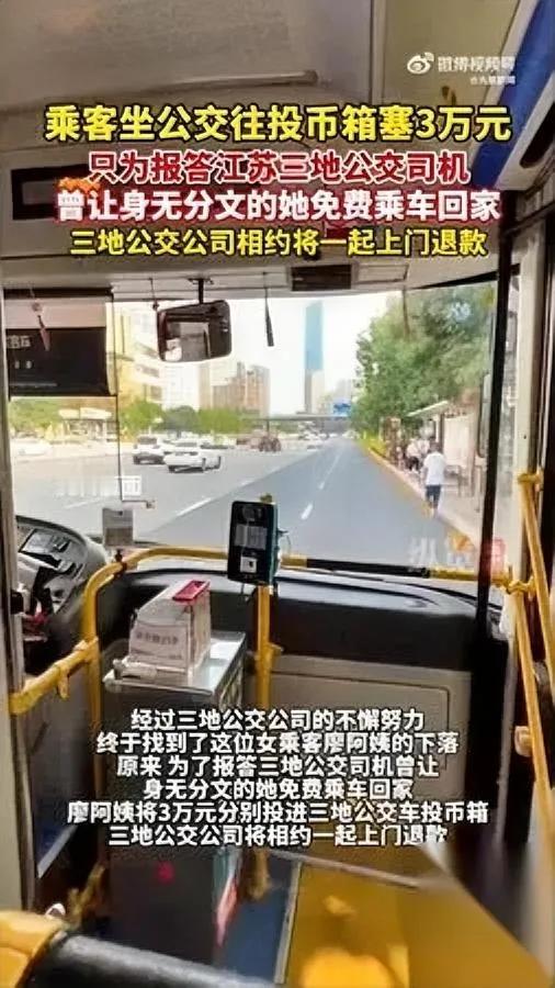 阿姨坐公交,投了1万! 不是多刷,是专门塞的现金—— 常州公交司机当场懵了:“这哪是车费?是一沓厚厚的红票子啊!” 一查更意外:她在无锡、宜兴的公交也各投了1万! 原来10年前她身无分文,三地的公交司机都挥挥手说“上来吧”,免费让她坐回了家。现在日子好了,她记着这份“能回家的暖”,就想着把当年的“善意”换成“真金白银”还回去。 有人说她“傻”,可我觉得这才是最实在的感恩—— 不是送烟酒,不是说漂亮话,是把别人给她的“退路”,变成了还给世界的“热乎劲”。 现在三地公交公司都在找她,要把钱退回去——公交是服务大家的,哪能收这份“私人情”?但阿姨的心意,早比钱金贵多了: 那是10年都没凉的“被记得”,是“我过得好,也想让你好”的真心。 你们有没有遇到过这样的“小暖”?比如陌生人帮你扶过箱子,老板多给你加了勺卤? 评论区聊聊,说不定你记着的那点甜,也能变成别人的光~