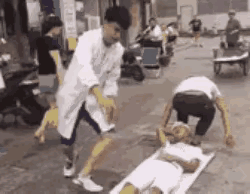 一个倒霉蛋遇到了两个不靠谱的帮手,不死也得脱层皮,看着忙中出错的样子,我严重怀疑他们两个是有预谋的,伤者只能是看你八字够不够硬,自求多福菩萨保佑吧!