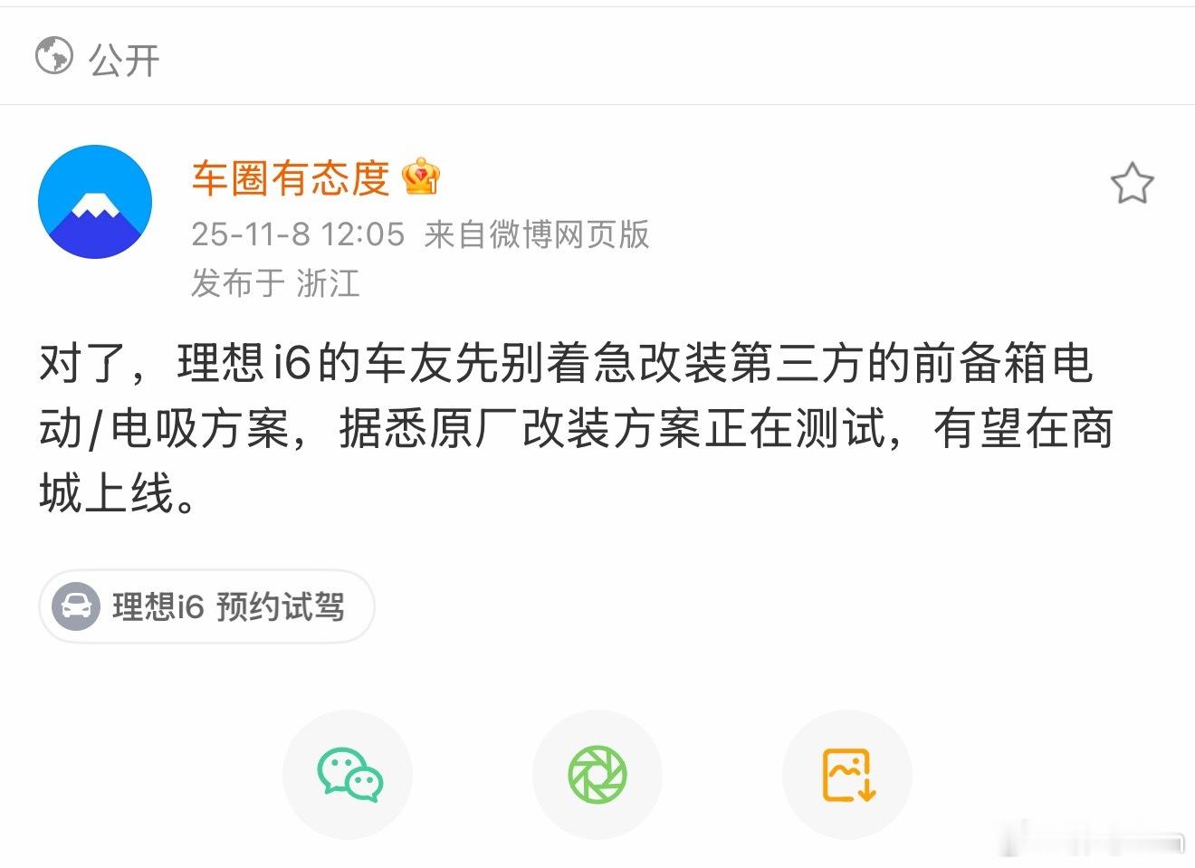 ✌️这可是好事,商城上架理想 i6 电动前备箱升级,类似年底的流媒体后视镜升级,从用户角度出发,倾听用户,懂用户需求,这才是正确的方向!