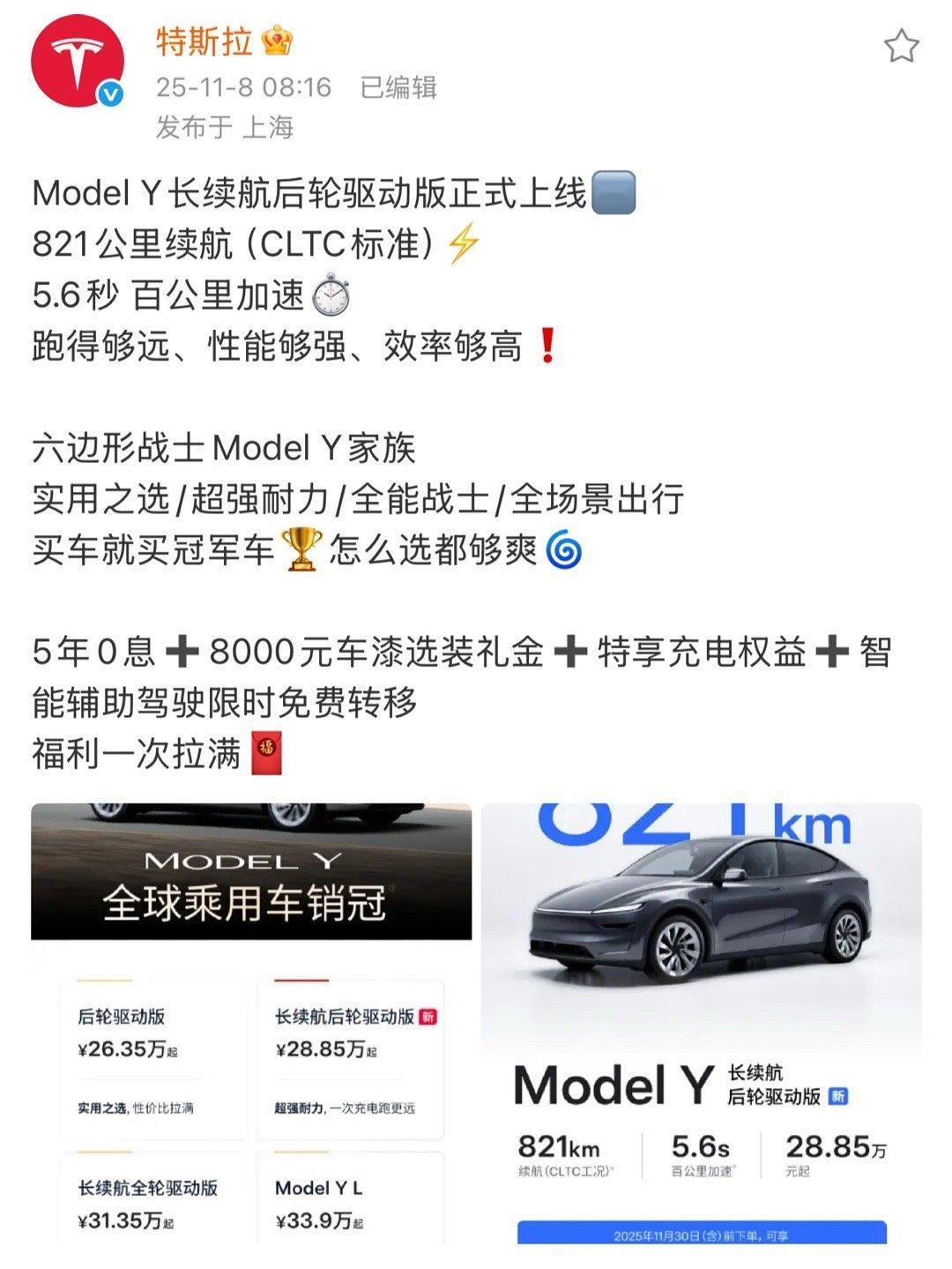 Model Y长续航后驱版上市 特斯拉Model Y新车型来了,售价28.85万元起。