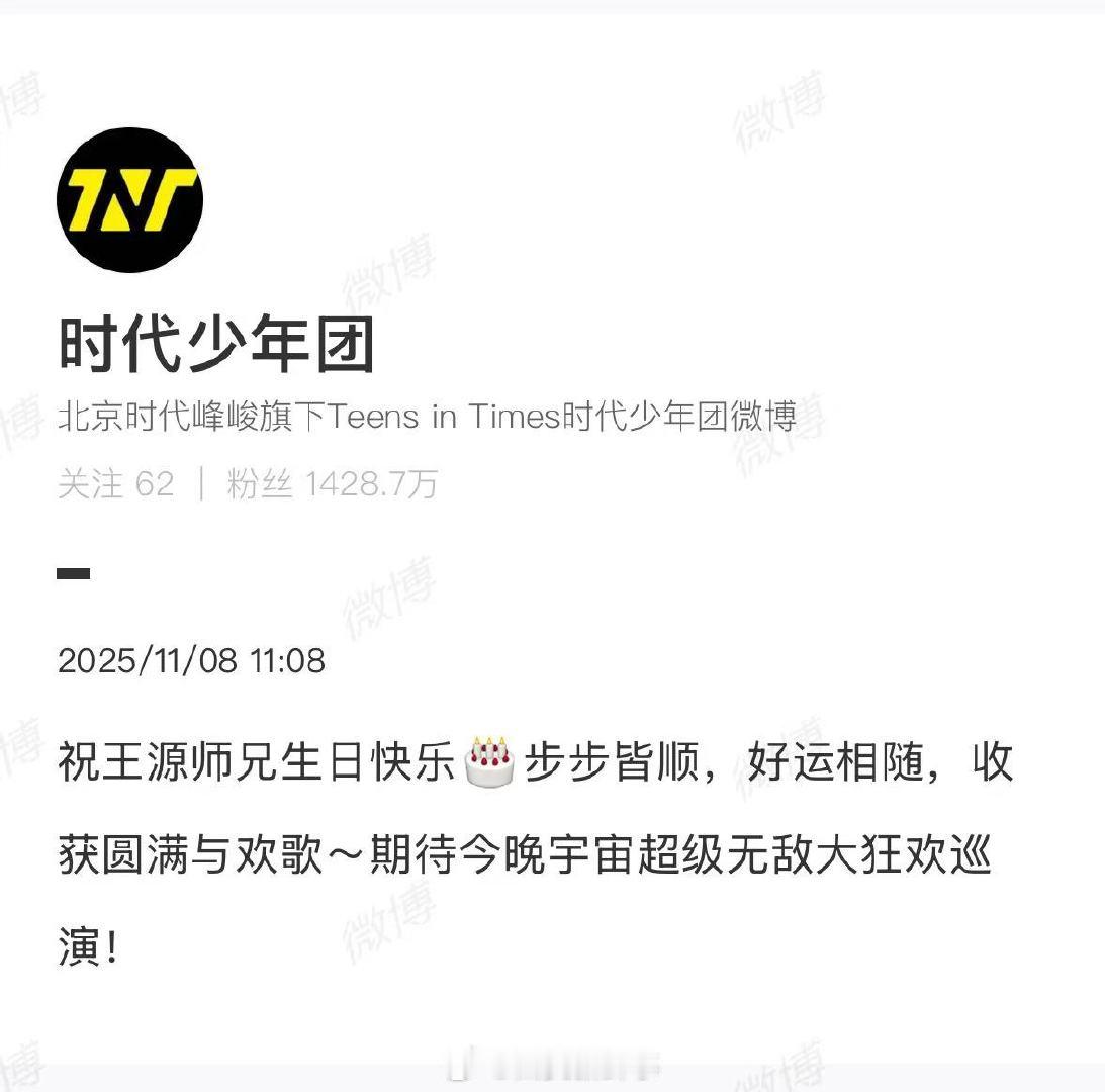 【时代少年团11点08为王源庆生】时代少年团祝王源好运相随11月8日,11点零8分卡点为发文庆生:“祝王源师兄生日快乐…步步皆顺,好运相随,收获圆满与欢歌~期待今晚宇宙超级无敌大狂欢巡演!”王俊凯卡点为王源庆生