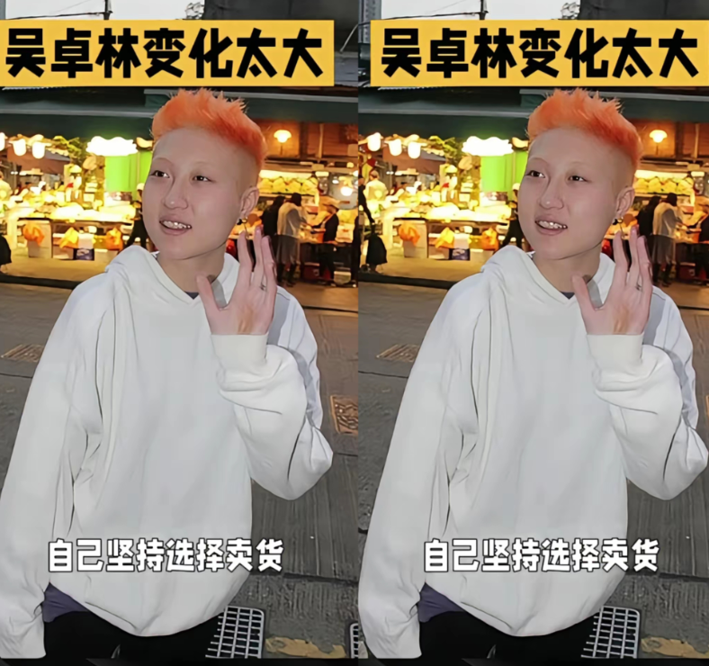 吴卓林在旺角摆摊卖货。 有了翻天覆地的变化,她身穿白色卫衣。 耐心给顾客讲解原创T恤的品质,说话有条理又有礼貌,完全没了过去的戾气。