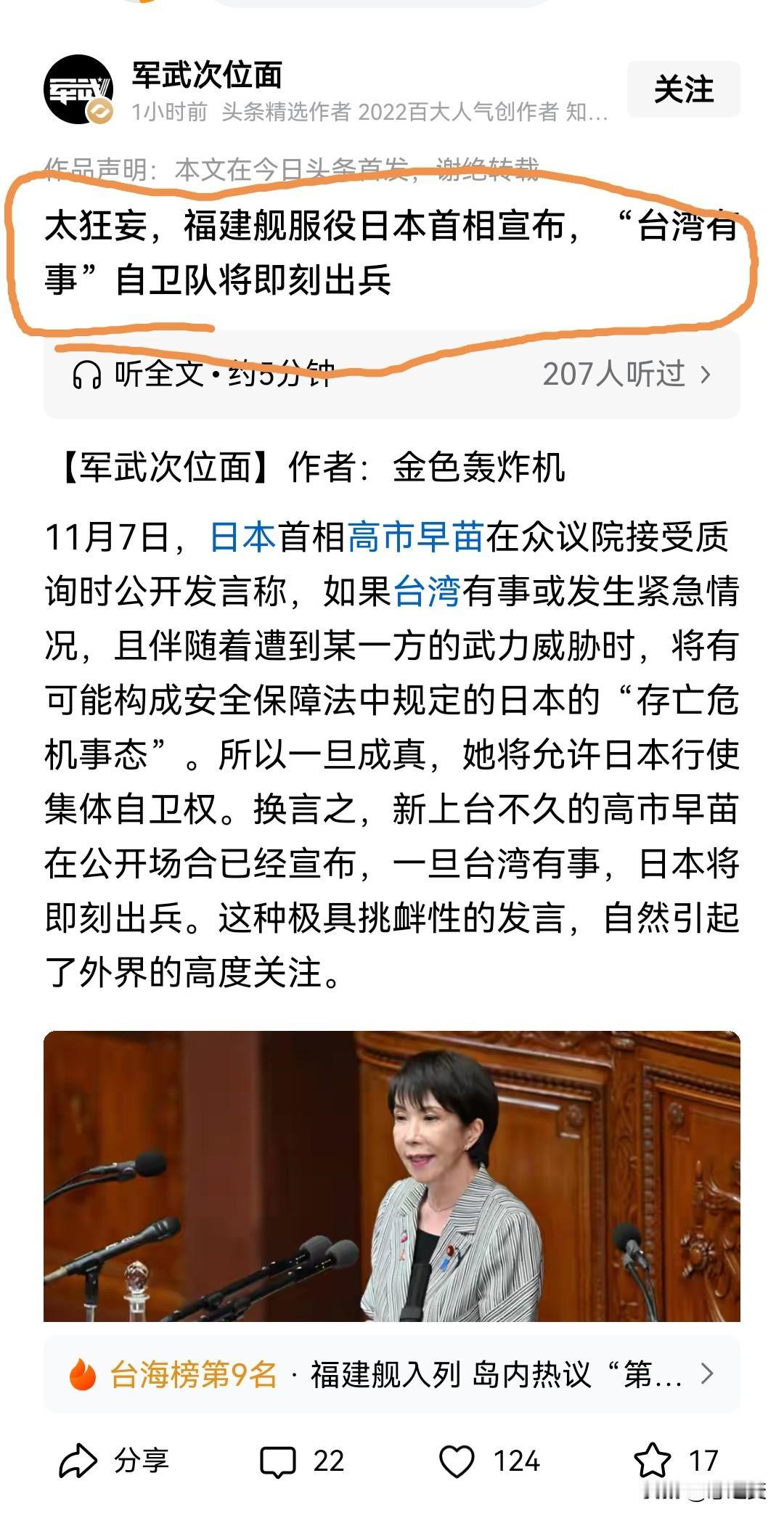 中国网友真怒了。 日本新上任的女首相,又发表了狂妄的言论,即台湾有事日本即刻出兵。 有网友认为,对于猖狂的日本,我们要暂时放弃和美国的对抗,与美国合作,把日本分掉。 我觉得这位网友非常有想法。我们可以暂时牺牲一点利益,先把日本这条狗打死吃肉。以后的事以后再谈。 大家觉得可以吗?