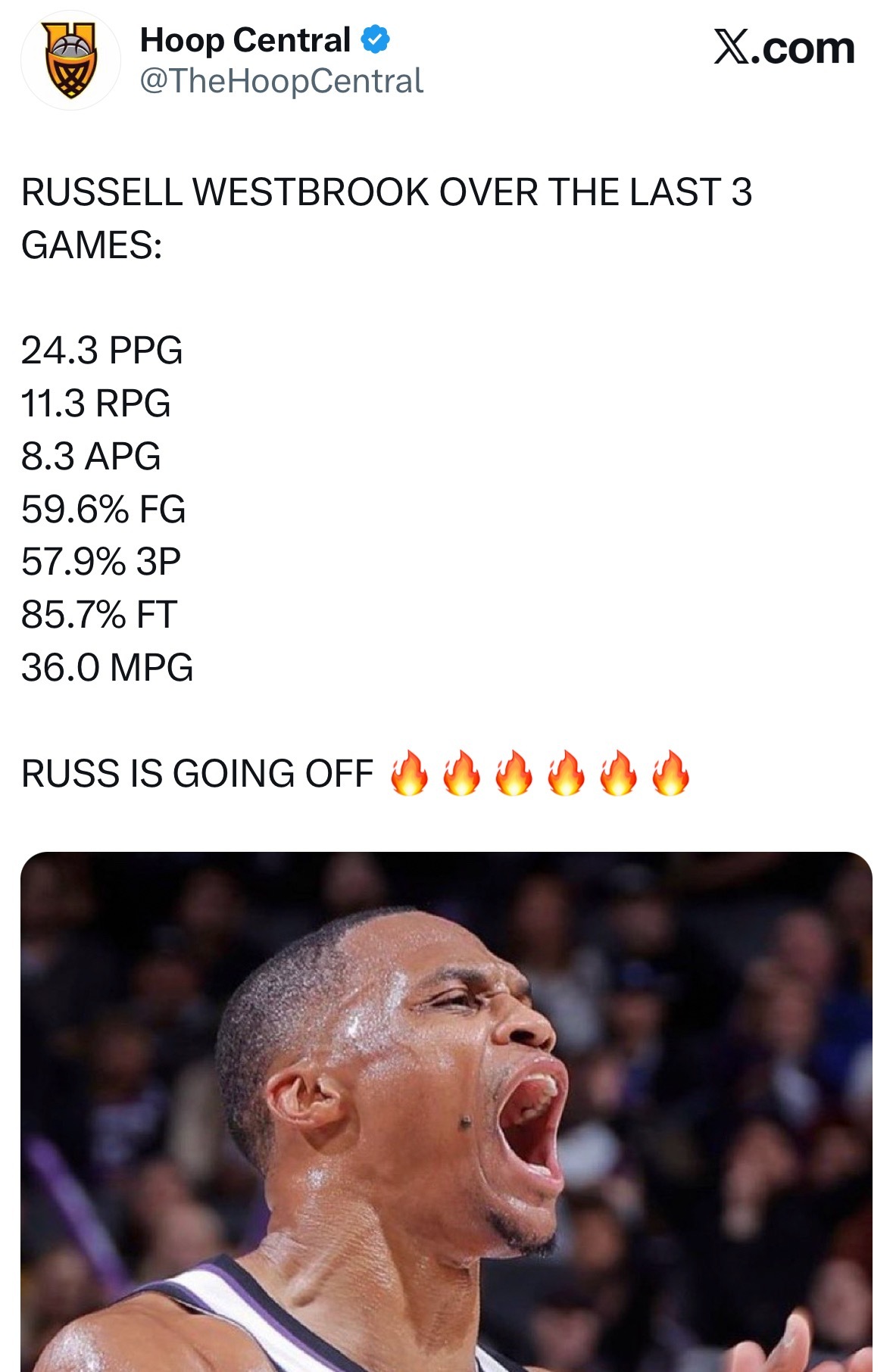 最近三场比赛,威少场均24.3分11.3板8.3助攻,投篮命中率59.6%,三分57.9%,罚球85.7%,梦回巅峰。