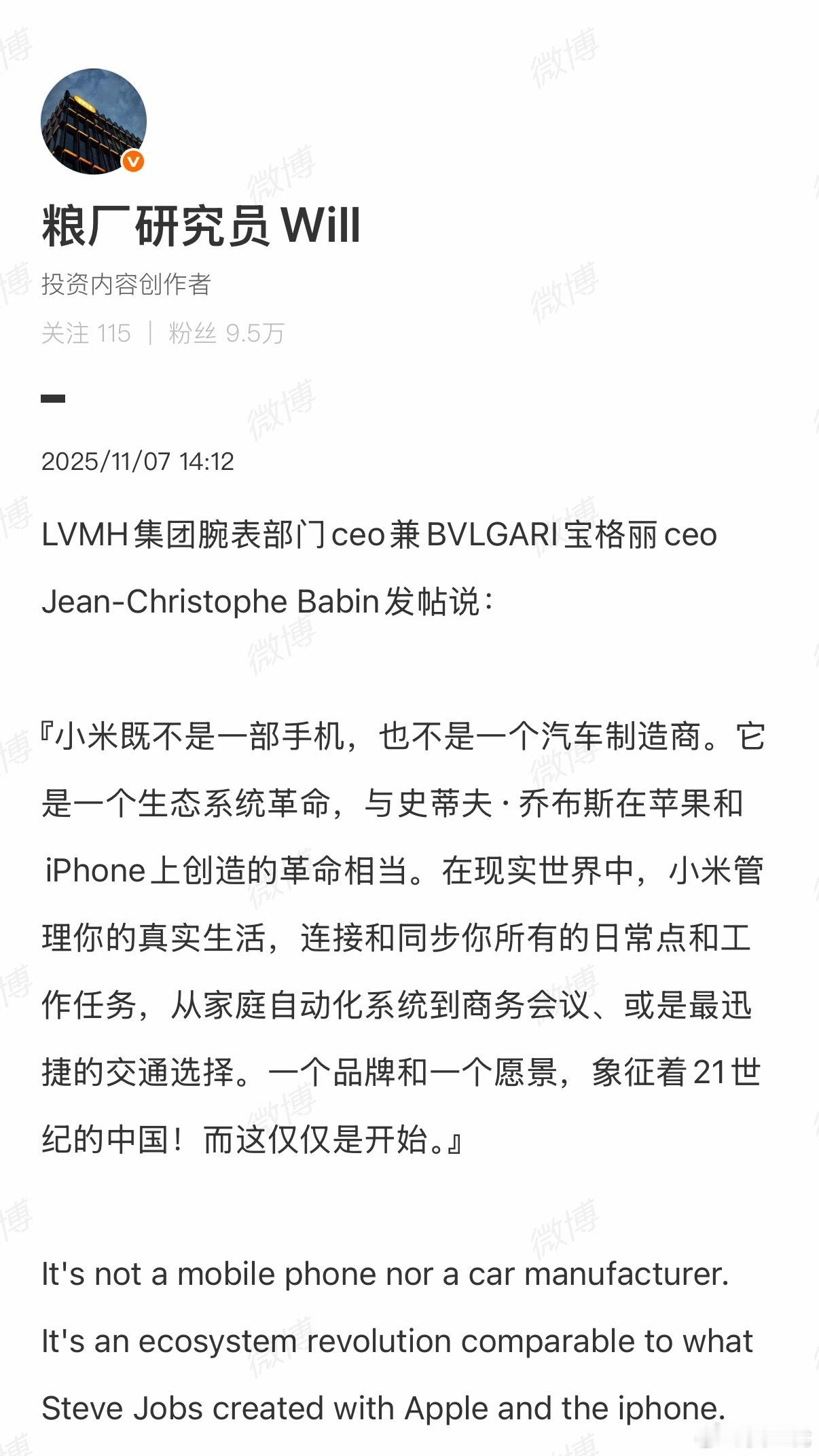 宝格丽CEO称小米成就堪比苹果他夸小米夸得还挺对,不是说某个产品好,而是整个小米人车家的生态,确实独一份[柯基]