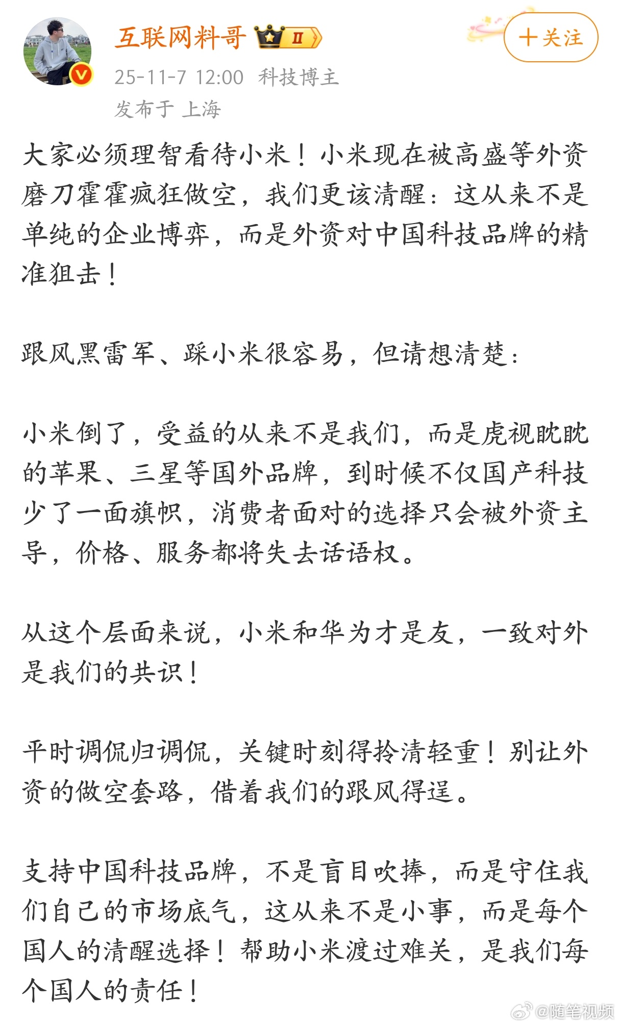 用户74xxx79 1 2025-11-09 17:20 小米公司从零开始,横空出世,以极其强大的开拓精神和抗压能力,砥砺前行,生产什么,什么就畅销,其主打产品几乎都能打进全国销售榜的前五名;他打破了行业垄断,产品一上市,几乎都能把市场均价下压30%以上,维护了消费者的利益。他们不迷信强者,敢于向苹果等著名品牌挑战,展现了中国人的自信心,促进了科技创新和行业竞争,尽管他仍有需要改进和完善的的地方,但小米和华为、比亚迪、大疆、海尔、格力等头部企业一样,不失为当代中国的优秀企业。