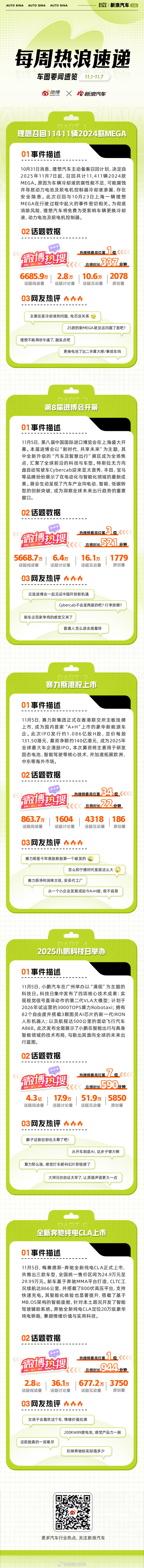 理想召回11411辆2024款MEGA,直面安全隐患展现企业责任担当;第8届进博会开幕,延续中国推动全球贸易合作的承诺;赛力斯港股上市,开启资本国际化新征程;2025小鹏科技日举办,宣布多项技术量产计划;全新奔驰纯电CLA上市,以全新电动平台角逐主流市场。