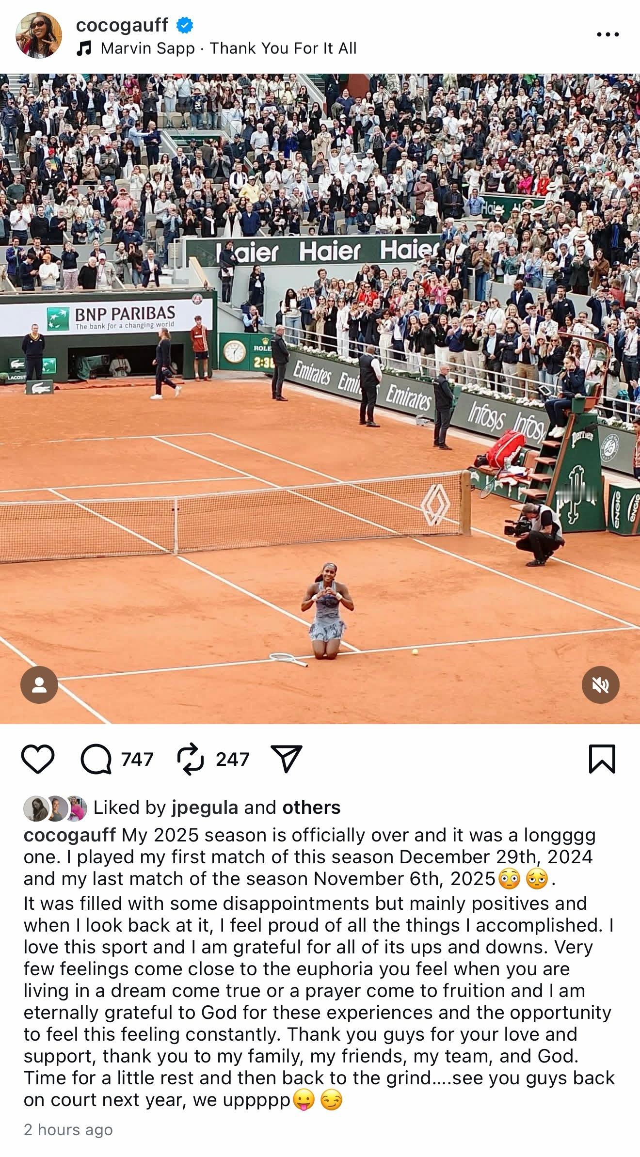 “我的2025赛季正式结束了,真是一段漫长而充实的旅程。我从2024年12月29日就打了本赛季的第一场比赛,一直到2025年11月6日才画上句号。