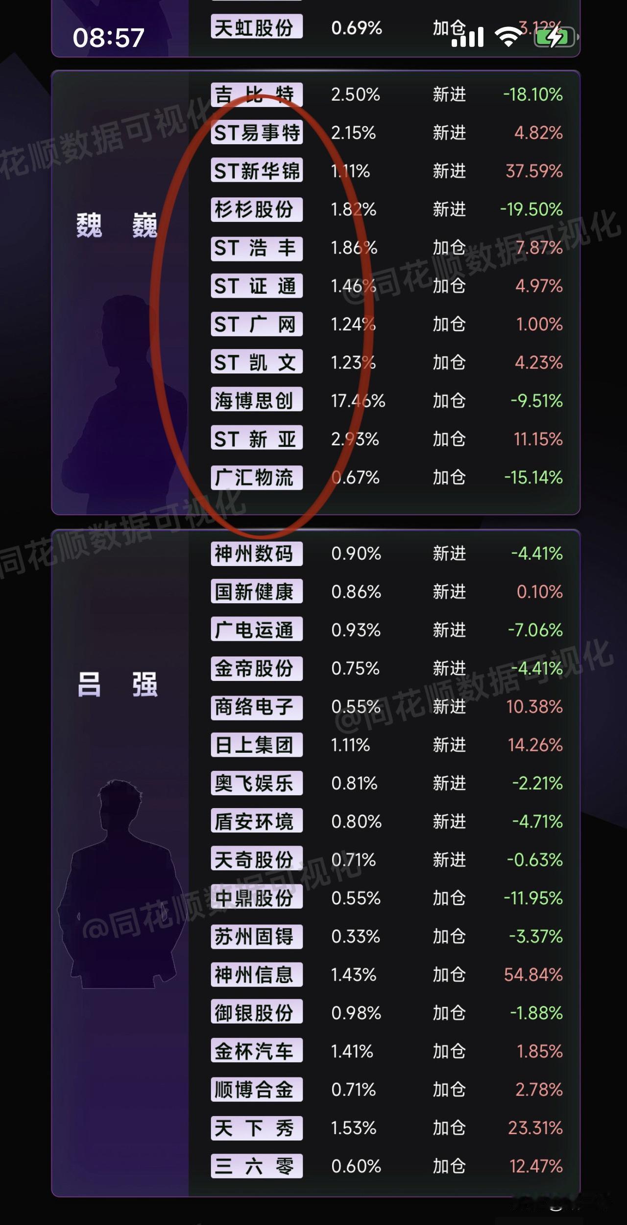 三季度惊现“牛散ST专业户”, 就在大数据披露三季度牛散新进持仓后, 网友惊奇发现: 大佬魏巍成了“ST股”专业户, 在统计范围内持有11只股7只是“ST”, 其中新华锦、易事特都是上古大能徐翔时代明星股… 这个思路非常清奇, ST无非是摘帽后的报复性修复, 比如山东墨龙。 假设100万元买10只, 只要押对一只10倍牛股, 剩下的就是白给! 本轮科技牛就有和章建平一样单压寒武纪, 凭借12倍涨幅将账户亏损变成白给的剩余价值! 在2015年牛市消灭低价股的行情中, 有靠这样“一网十鱼求一大鱼的玩法”! 但并不适合大多数股民, 你玩不转的…