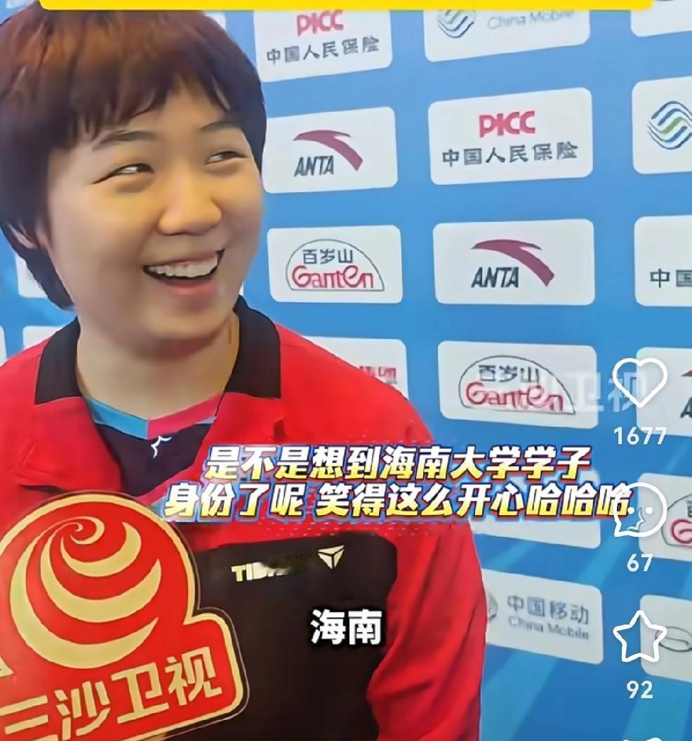 蒯曼越来越可爱, 也越来越受到更多关注了。 蒯曼搭档陈垣宇八分之一决赛击败了徐瑛彬范姝涵, 赛后采访海南媒体专门叫下蒯曼, 然后介绍自己是海南媒体。 问蒯曼有什么想对海南观众说的吗? 把蒯曼都问愣了一下, 哈哈,蒯曼是海南大学的, 平时搭档海南的独苗林诗栋打比赛, 可能他们也对蒯曼比较喜爱。