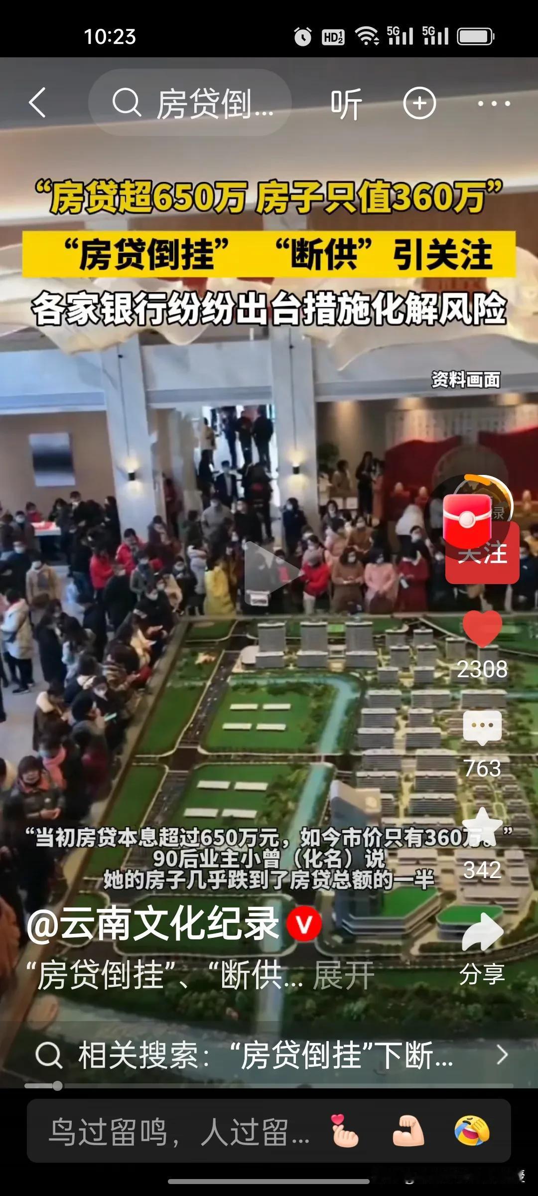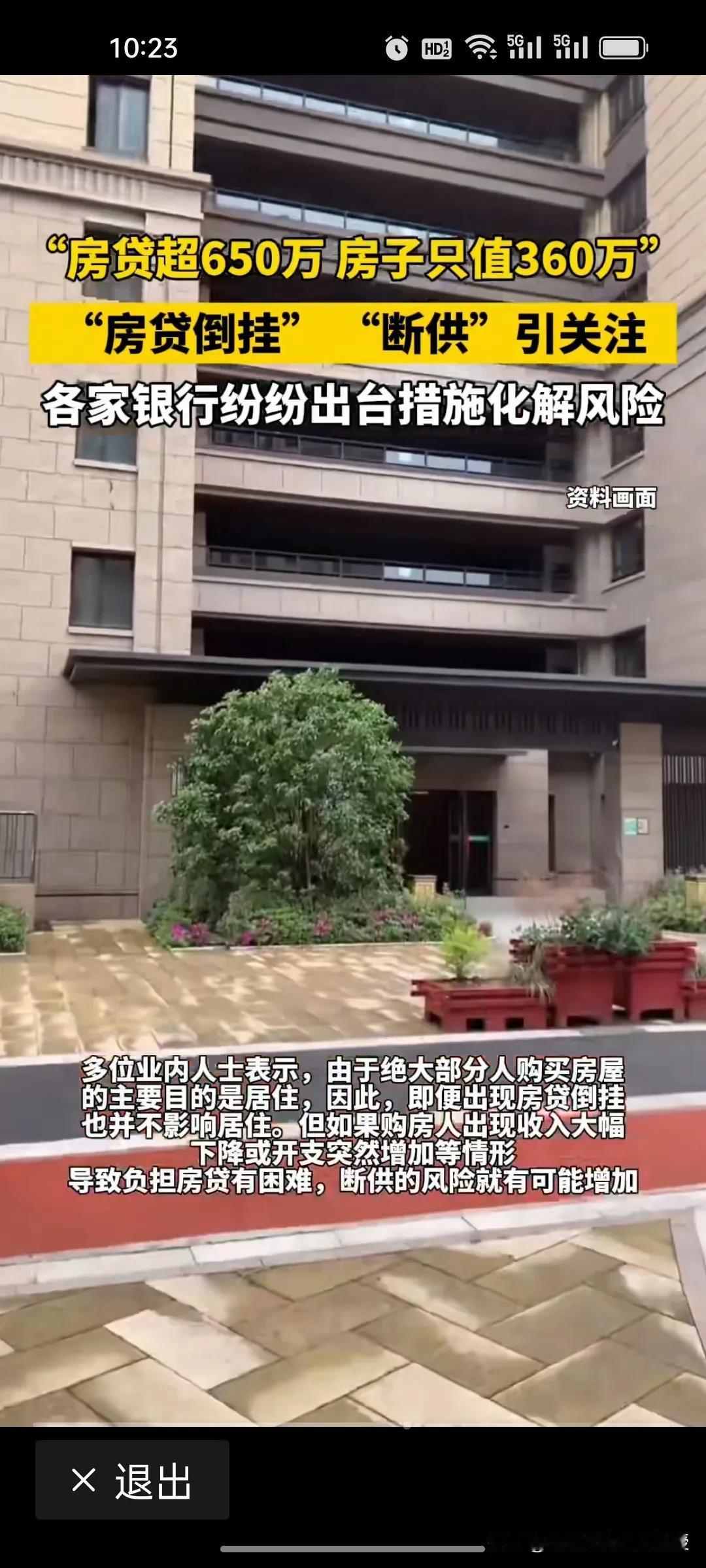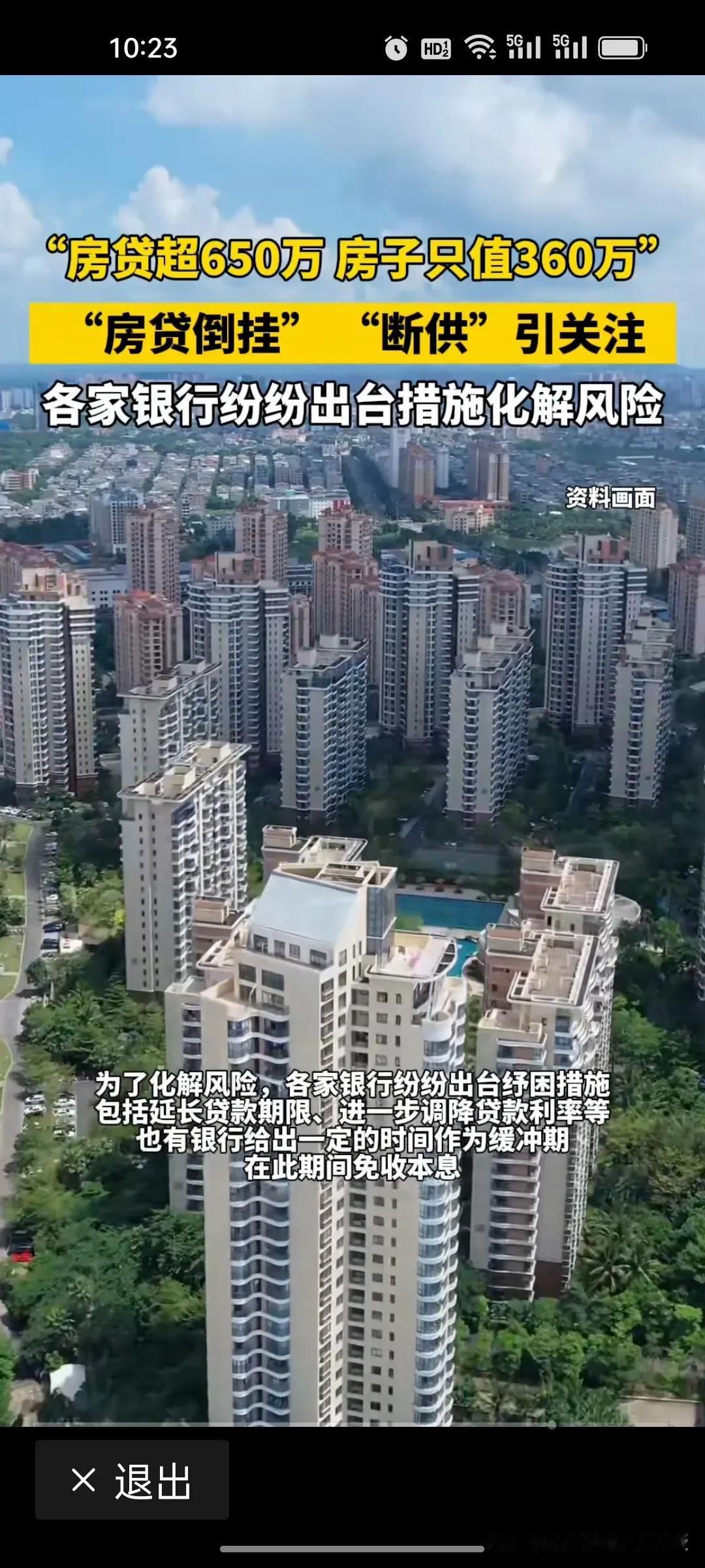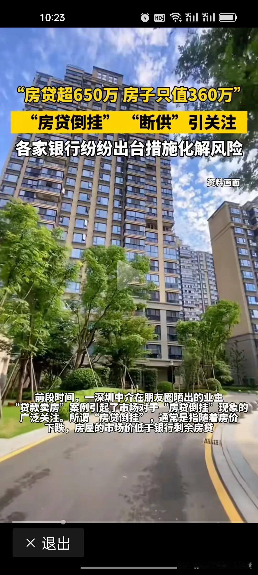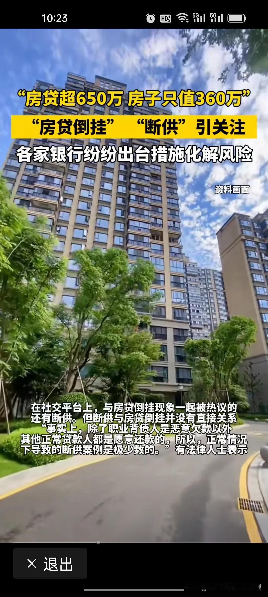 房子只值360万,可房贷650万,房子市值已经跌到了贷款总额的一半,你该怎么办?会选择断供吗?这是摆在90后小曾面前的难题。 在“房贷倒挂”现象下,越来越多的银行已经主动出手化解风险,未来存量房贷利率进一步下调应该是大趋势。 有网友说自己已经断供一年了,可是房子还在住,说明银行已经给业主一定时间做缓冲期免收本息。 之前看到付鹏说房价跌了,自己住着不卖就不亏,这个是对没有贷款的人说的,如果你的剩余贷款金额已经超出你的房子现在的价值,你肯定是无比难受的。