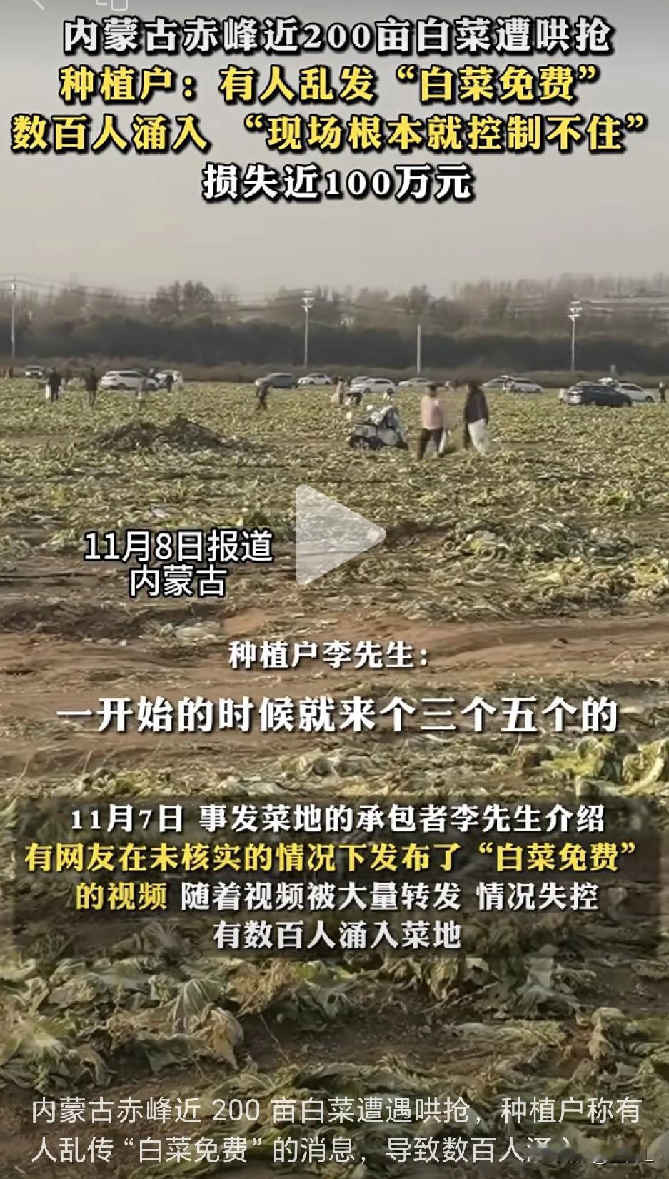 从“砍两棵吃”到“抢两百亩”:一则误传,照出多少人性的贪婪! 11月初,内蒙古赤峰,有网友发布“白菜免费”的视频,后被大量转发,引起了大规模的关注。 开始只有零星当地村民去砍白菜,种植主李先生也没有特别阻止,只说,砍两棵自己家吃就行了。 没想到,11月7号-8号,开始有大量市民拿着麻袋、三轮车甚至货车涌入菜地。人数最多的时候高达七八百人,李先生和他的员工们根本无力阻拦。 近200亩的大白菜,被哄抢两天,白菜被一扫而空,甚至部分已对接销售渠道的白菜也未能及时收割。 据李先生的初步估算,经济损失近100万元。 目前,警方已经介入调查,但目前尚无明确处理结果。 今年确实有免费捡土豆、捡白菜的、摘辣椒的,但都是当地农民已经收获结束,还剩余一些个头小的或者长的不太好的,就是农民朋友们不要的。 有人捡回家,还可以发挥余热。所以,当地也鼓励大家去农场“淘宝”,还可以给当地旅游带来一些人流。 但赤峰的大白菜,明显就是人家还没有开始砍,这些去了就哄抢的人,估计很多人存下了“法不责众”的侥幸心理。 就算主人出言阻止,也被他们有意无意的选择无视。 网友们纷纷出言: “抓住幕后黑手!” “前段时间,各种博主发去捡土豆,当时就害怕后续会出现这种跟风,无脑疯抢的!” “必须严惩!从网络入手,让始作俑者和传播者赔偿菜农巨大损失!” “怎么能这样呢、人家种的菜你们咋那么大的“脸”去砍、这是明抢呀!” “乱发信息的,该承担赔偿责任。” “别拿善良赌人性!” “应该是有群,完了群里一发这里免费的白菜,都去了。第一个发视频的人就是坏的!” 第一个发视频的人或许只是为了追求流量,发布了不实信息。没想到被大量转发,最终引发了这起哄抢事件。 当地乡政府表示“以官方通报为准”。法律专家指出,哄抢者可能面临拘留、罚款甚至刑事责任;造谣者和转发者若造成严重后果,也需承担民事或刑事责任。 这起事件从一个网络误传开始,最终演变成一场暴露人性贪婪与社会治理难题的闹剧。 在网络时代,信息的核实至关重要,而法律的尊严也绝不会在“法不责众”的喧嚣中褪色。每一个参与哄抢的个人,都应为自己的行为负责。 信息来源于新晚报,侵联删!
