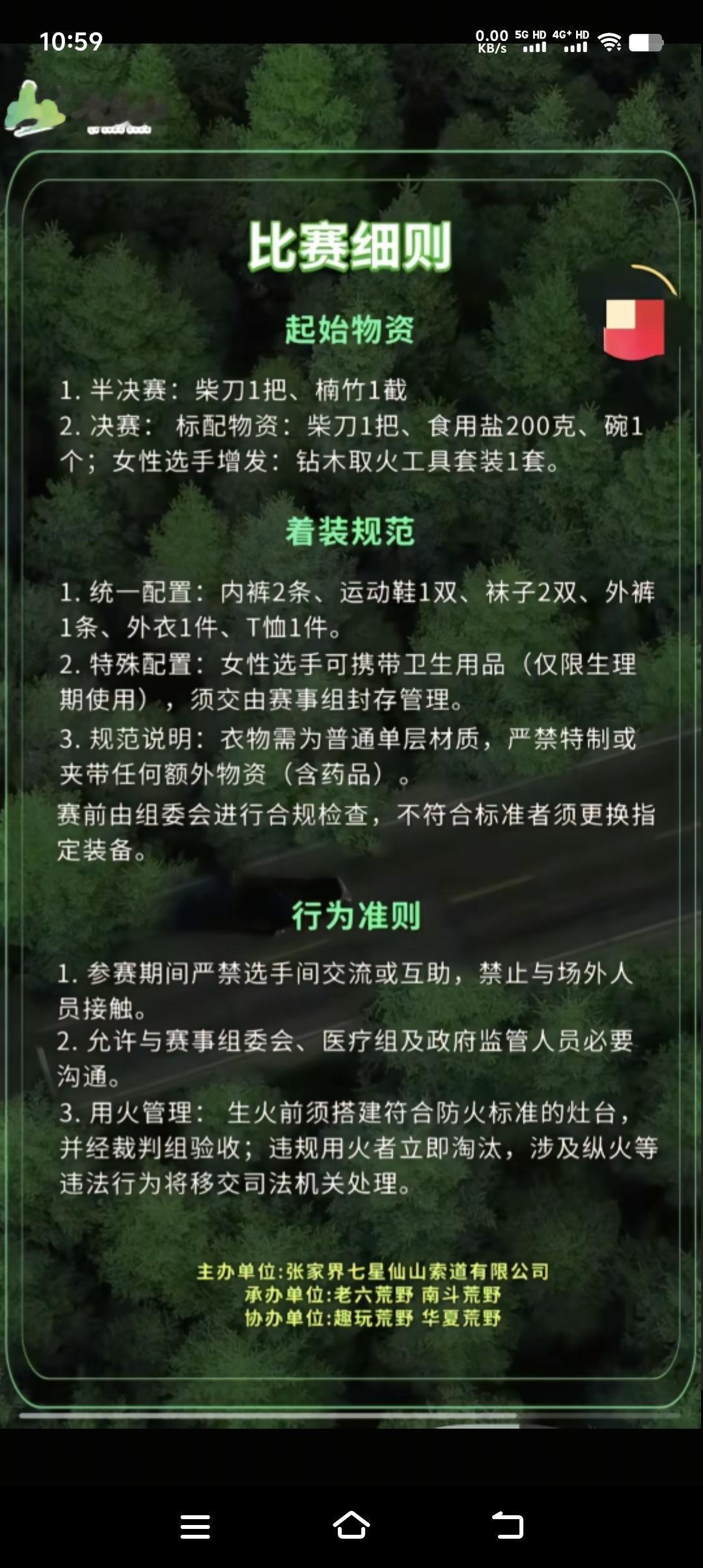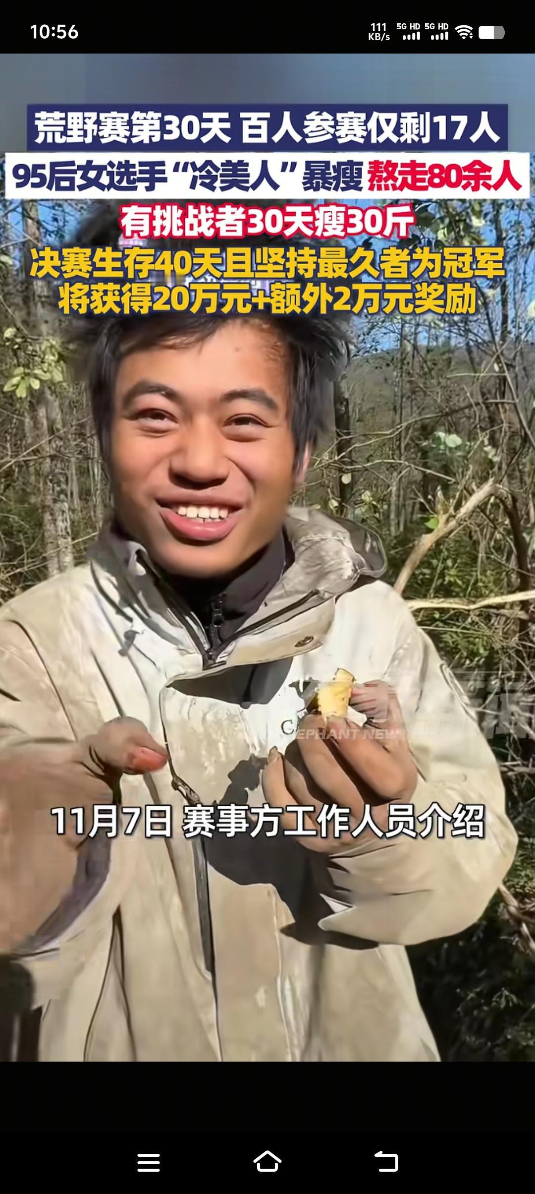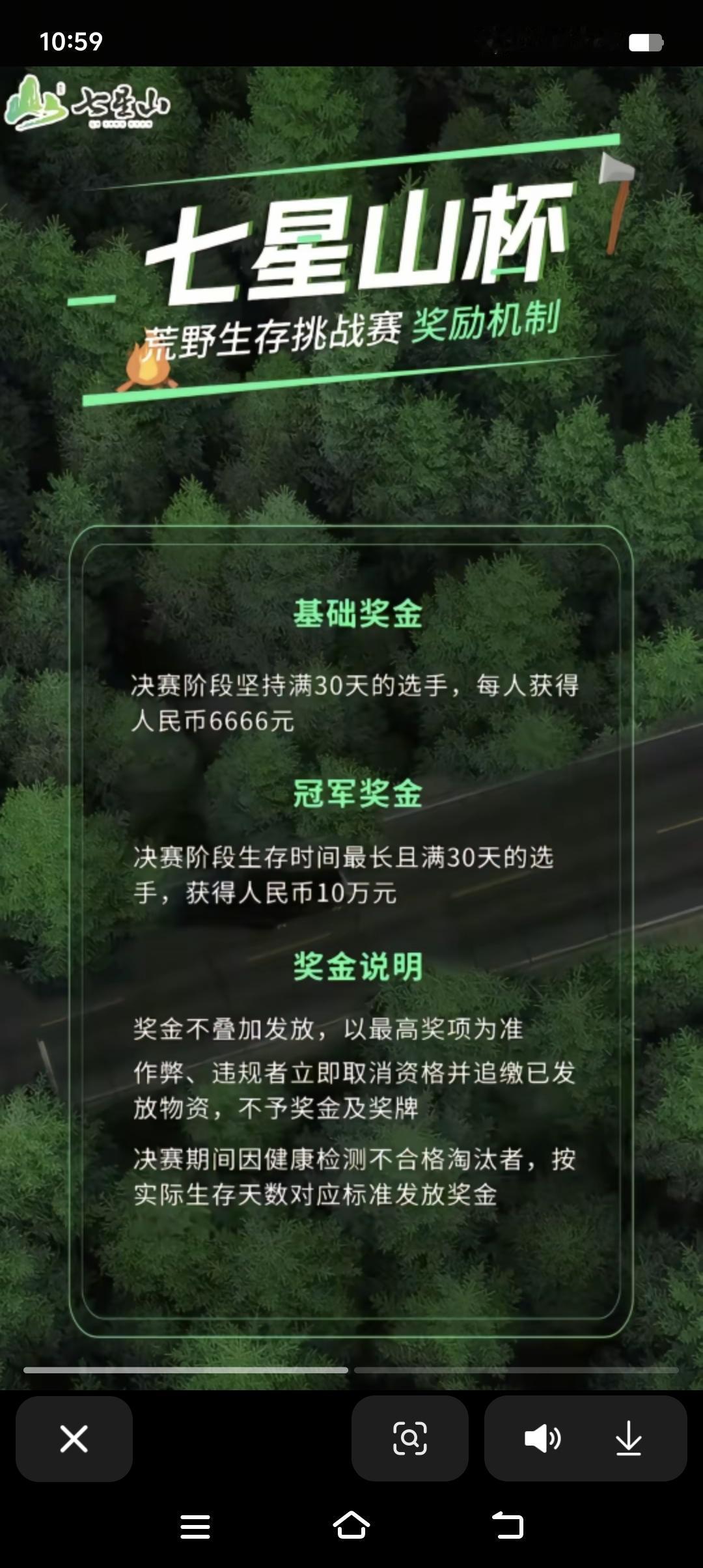 国外荒野求生,国内荒野求金。国外用自己所掌握的技能和知识挑战大自然,苦中作乐,国内用自己的意念挑战自己的身体极限,苦中没乐。 100名参赛选手,持续60天,淘汰至10人晋级决赛。决赛无时间上限,坚持到最后一位即为胜利者。决赛阶段坚持30天及以上选手,奖金6666元,也就是说相当于你挣了一个月的工资。 第一庙张家界七星山杯荒野求生冠军来自湖南90后杨东东,历经69夜70天的野外生存,最终勇挫九名选手,喜提10万奖金和奖牌。 70天挣10万,绝不是一般人能做到的,因为70天熬的不是你的身体,更是你的意志。