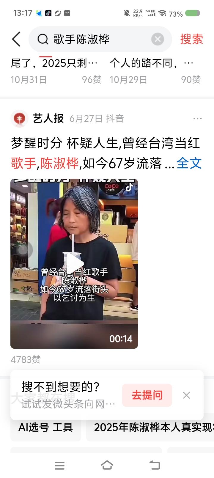 陈淑桦流落街头了?—— 网上信息:歌手陈淑桦流落街头,接受捐赠品。 点评: 为什么?病了? 家中有什么变故?