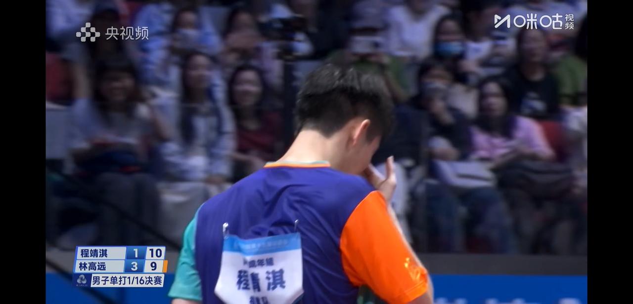 全运会男子单打1/16决赛, 林高远4:2程靖淇。 虽然程靖淇没有晋级, 但林高远两个人打的也算是比较激烈了, 第五局打到14:16程靖淇拿下, 但林高远笑到了本场最后。 恭喜林高远晋级下一轮男单。 六局比分分别是11:6,11:4, 5:11,11:2,16:14,11:7。 比赛中还发生了点小插曲, 林高远回球, 不小心打到了程靖淇的眼睛, 应该没有大的妨碍, 没有要暂停继续比赛结束。
