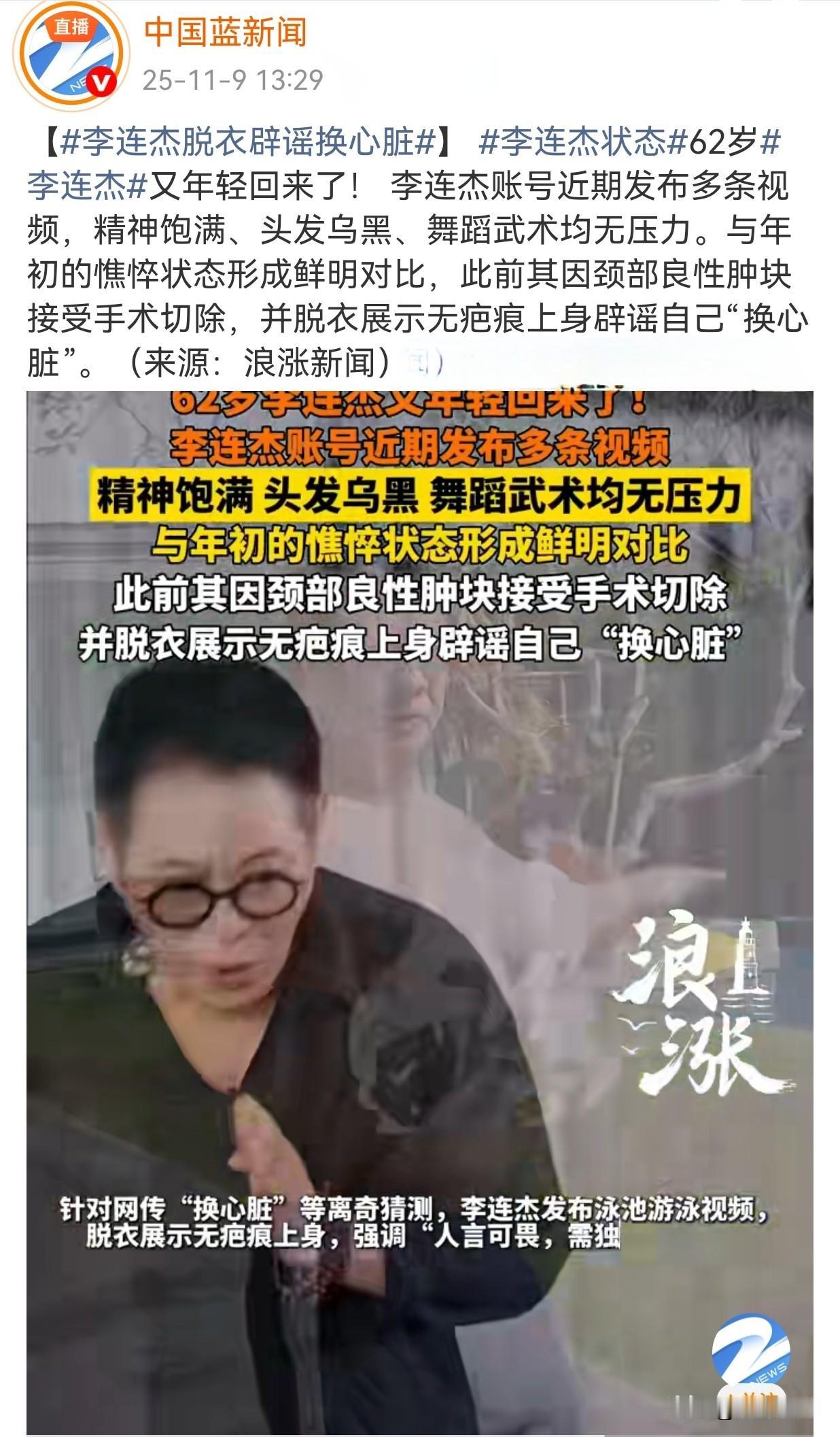 学会独立思考🤔谣言止于智者! 25年8月,李连杰因颈部良性肿块接受手术切除,术后一张病床照(面色苍白、插输氧管)被恶意解读为“生命垂危”。这以后就有传言称武僧秋风车祸离世(遗体有缝合痕迹)于李连杰关联,臆测其“借运换心”,甚至更有甚者说“更换头盖骨”“穿人皮衣服”“九眼天珠玄学”等谣言。 在这之后为了辟谣,25年11月初李连杰发布游泳视频,赤裸上身展示前胸后背,强调无任何手术疤痕。视频里他动作矫健,与宠物犬嬉戏,精神状态饱满。面对谣传的信息,李连杰他直言道“人言可畏”,呼吁公众要“独立判断,勿消费逝者不幸”,并且否认认识武僧秋风。 自从李连杰于13年确诊甲状腺功能亢进后,经多年药物控制及术后调养,症状显著改善。结合太极、中医调理、饮食控制及心态调整,身体逐步恢复健康。并且专注公益、书法修心,倡导“每一天更好地活着”。身体状况的迅速康复,这和他自幼习武的体质基础,并通过持续锻炼这样才能这样维持身体良好机能。 有时候真的感觉咱国家九漏鱼有这么多吗?这群人又失智又迷信的好像真的没救了,李连杰今年才60出头有这个状态很夸张么?我父母之过八十了,才去漠河自由行回来😀这些人是因为智商太低,所以才会沉迷阴谋论显得自己很厉害的样子吧。 所谓李连杰的“逆生长”本质是科学治疗+自律养生与豁达心态的共同的成果。当网友们关注名人健康时,应尊重隐私、理性思考,避免被谣言裹挟。李连杰