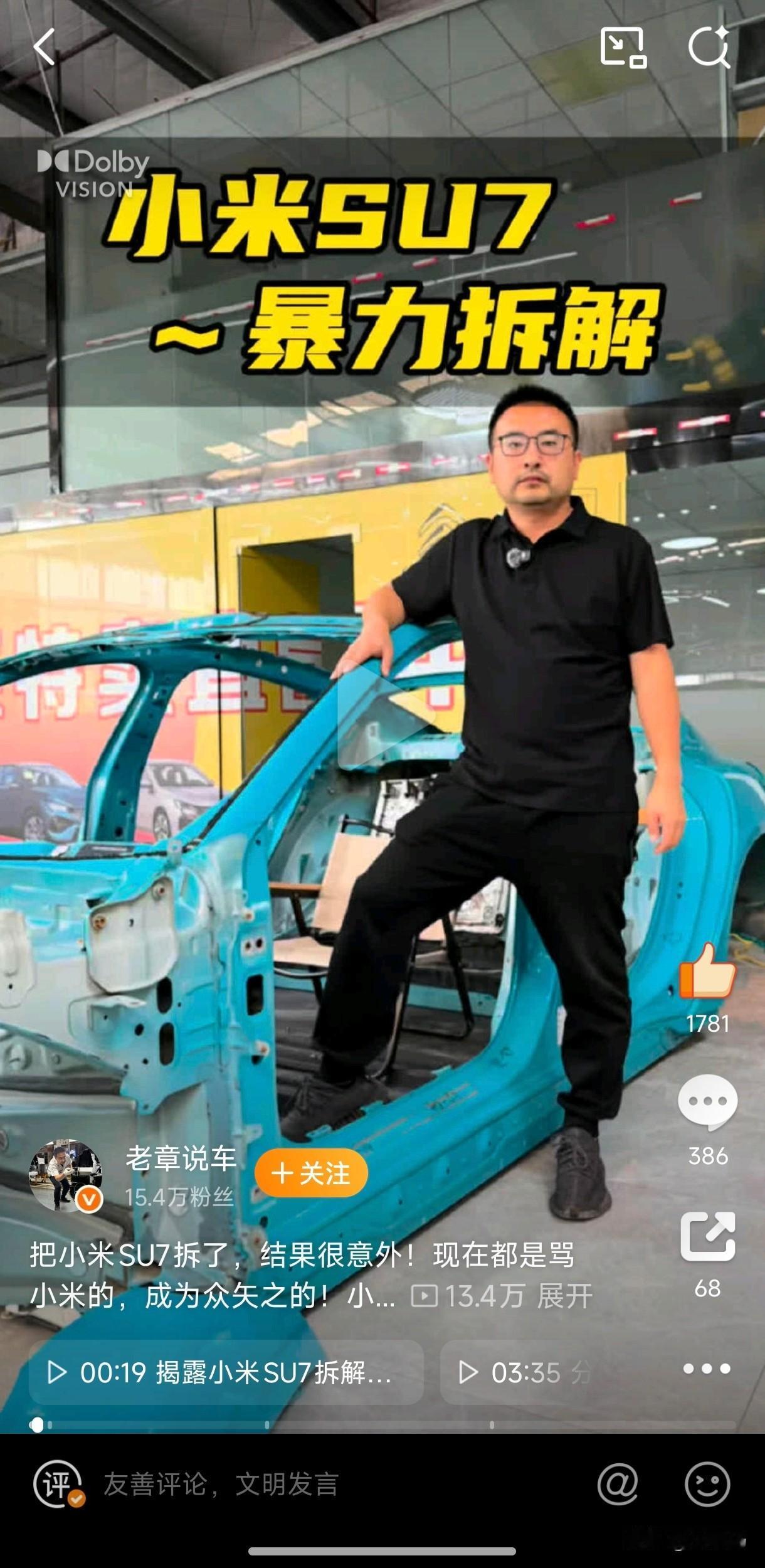 老章拆车,其实,上次拆解直播的时候我就说过。他因为拆解了一台小米SU7,只是实事求是说这台车子很多地方的用料和设计,都超过了同级不少车型,值得其他厂商借鉴学习。结果,直播间一下子涌进一群黑子,对小米汽车进行了攻击,甚者很多都直接攻击主播,言语难听,搞得老章不得不把其他车子的内容插了进来,待这波人散了后才继续讲解小米SU7的拆解细节。 这次,老章把小米SU7的拆解视频剪辑发了出来,从内容看讲解的非常专业,也非常客观。小米SU7好的地方会夸,小米SU7不好的地方也会说。观众们通过视频了解到,其实,小米SU7一经拆解,很多地方的用料并不像网上黑子们传得那样偷工减料,而真实的情况对比同级新能源产品,小米SU7很多地方都更加优秀。比如通风刹车盘、电池的防护、镀锌工艺等,小米SU7都是同级顶级的。 而正是这种正面的视频,受到了又一波黑子的狂喷,有骂老章收钱的,有举报视频的,反正这群人像是永远活在自己的认知里,别人的真话到了他们的世界就成了“假”。 这么一波攻击,让博主非常的难受,甚至表露出了以后不敢再碰小米东西的心态。不是因为小米产品不好,而不敢碰,而是因为正面说小米被喷的不敢再碰,你们说说现在都网络环境怎么变成了这样? 黑子们、那些个带节奏的黑媒们,最喜欢干得事就是断章取义,到处传播小米“速度就是信仰”、“200米瞬间刹停”等信息,却完全不顾小米同时表达的安全驾驶部分内容,掐头去尾,娱乐洗脑不知真相的大众。他们为什么这么干?就是因为一个好产品的出现,打破了传统格局,上一个有这种待遇的好像就是特斯拉吧? 我希望小米还是不要太受外界影响,把注意力集中在产品上,只要把产品做得足够极致,肯定能像特斯拉一样,扭转乾坤,打脸那些黑子和黑媒们。