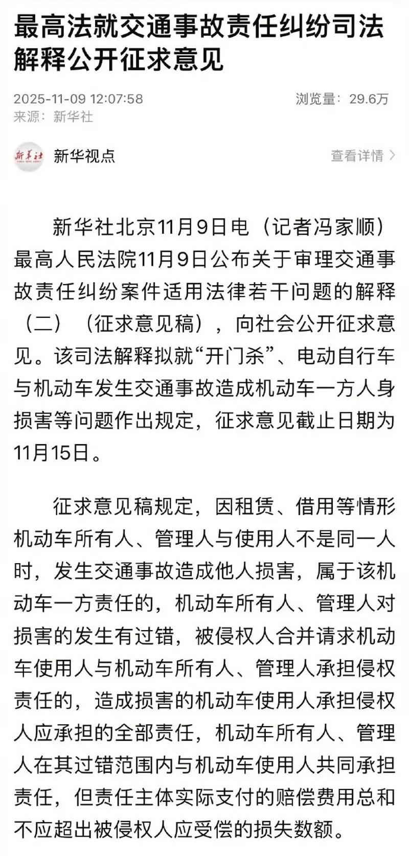 【最高法公开征求意见 拟就“开门杀”等问题作出规定】11月9日,《关于审理交通事故责任纠纷案件适用法律若干问题的解释(二)(征求意见稿)》公开征求意见,该司法解释拟就“开门杀”、电动自行车与机动车发生交通事故造成机动车一方人身损害等问题作出规定,征求意见截止日期为11月15日。 征求意见稿规定,因租赁、借用等情形机动车所有人、管理人与使用人不是同一人时,发生交通事故造成他人损害,属于该机动车一方责任的,机动车所有人、管理人对损害的发生有过错,被侵权人合并请求机动车使用人与机动车所有人、管理人承担侵权责任的,造成损害的机动车使用人承担侵权人应承担的全部责任,机动车所有人、管理人在其过错范围内与机动车使用人共同承担责任,但责任主体实际支付的赔偿费用总和不应超出被侵权人应受偿的损失数额。 征求意见稿同时规定,机动车乘车人开车门致他人损害,被侵权人主张乘车人责任属于机动车一方责任,并依据民法典第一千二百一十三条请求承保机动车交通事故责任强制保险的保险人在责任限额范围内予以赔偿、承保机动车第三者责任商业保险的保险人按照保险合同的约定予以赔偿的,人民法院应予支持;保险人以乘车人不属于被保险人或其允许的驾驶人为由主张不向被侵权人承担赔偿责任的,人民法院不予支持。 征求意见稿提出,电动自行车与机动车发生交通事故造成机动车一方人身损害,机动车一方有证据证明电动自行车一方存在过错,并主张电动自行车一方承担赔偿责任的,人民法院对赔偿数额的确定应当综合考虑行为人过错程度、损害后果、事故各方交通工具危险程度等因素。 征求意见稿还针对非营运机动车发生交通事故造成无偿搭乘人损害,以挂靠形式从事道路运输经营活动的机动车发生交通事故等作出规定。【来自懂车帝车友圈】
