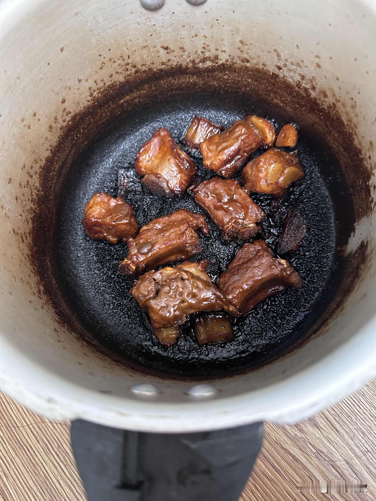 今天的快乐是8块排骨给的。 一顿操作猛如虎,掀开锅盖心好堵。下午早早拿出冰箱里的排骨解冻,准备给女儿做个红烧排骨。 技术不好的我还炼了冰糖,笨拙的给排骨上个糖色。前边都还算顺利,本来想用炒锅慢慢炖,可是一想还是高压锅快,问她要不要加土豆,说不要,那就这几块排骨吧。 也不知道是不是水加少了,还是时间长了,也没看表,再后来闻着不太对啊,我说坏了,肉糊了,女儿说挺香的糊味。 放完气打开直接把自己逗笑了,得!重新炒别的菜吧。 以前用高压锅也没出现这情况,肯定是水太少了吧!