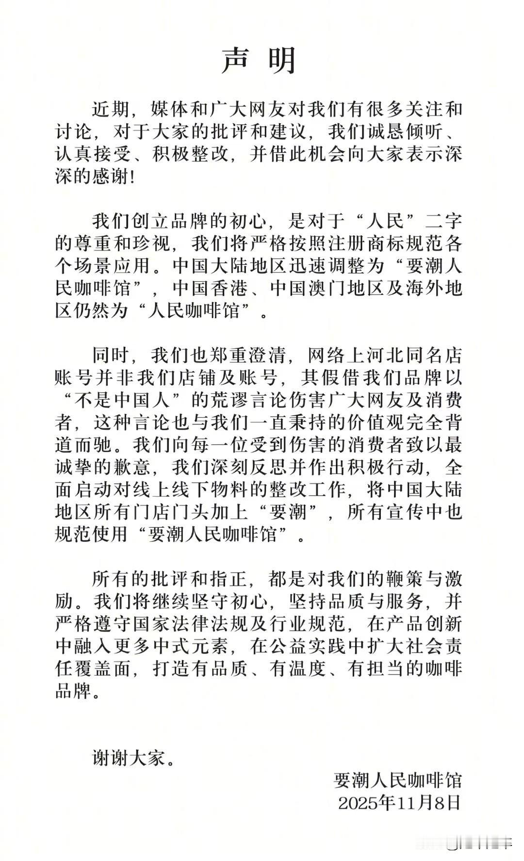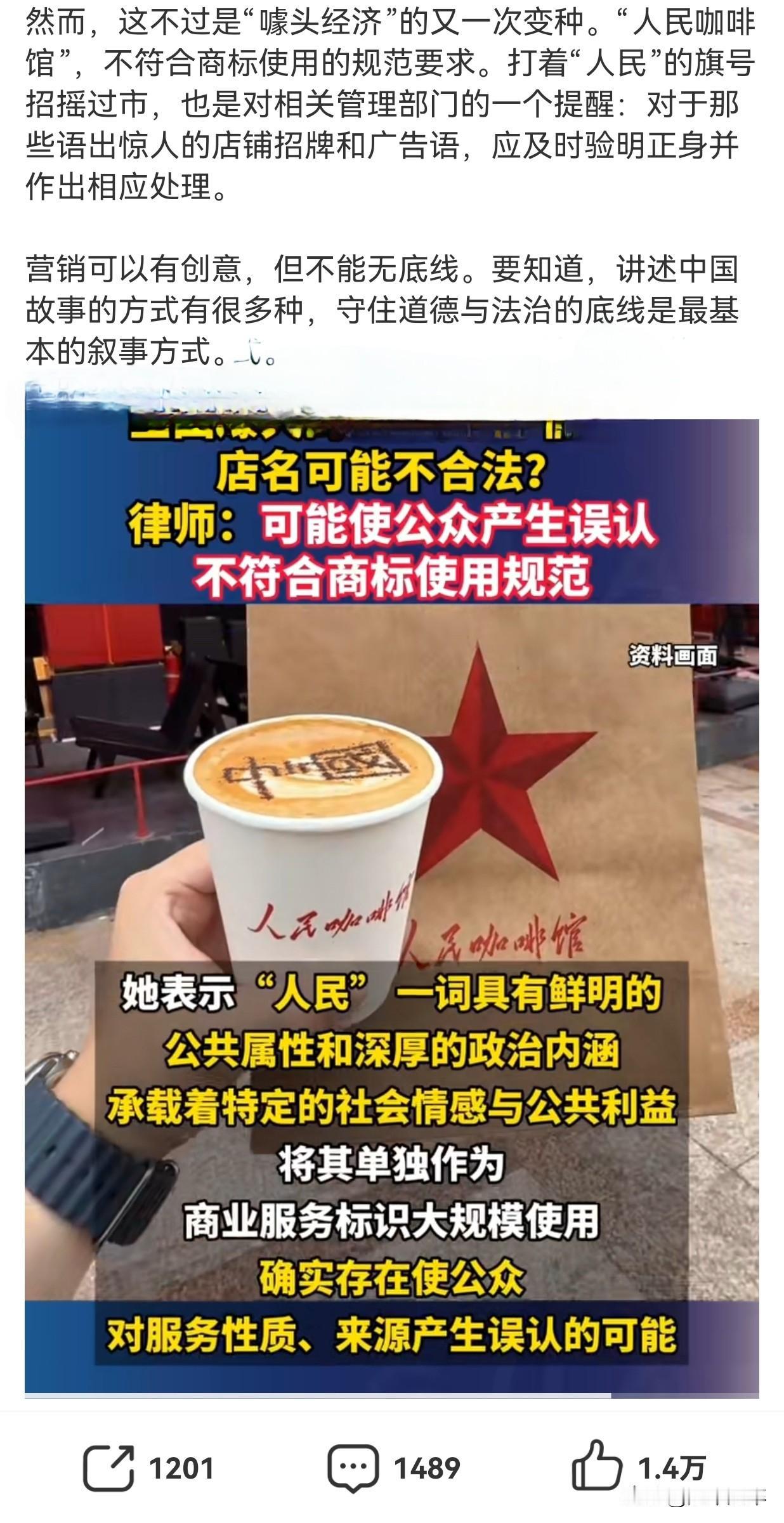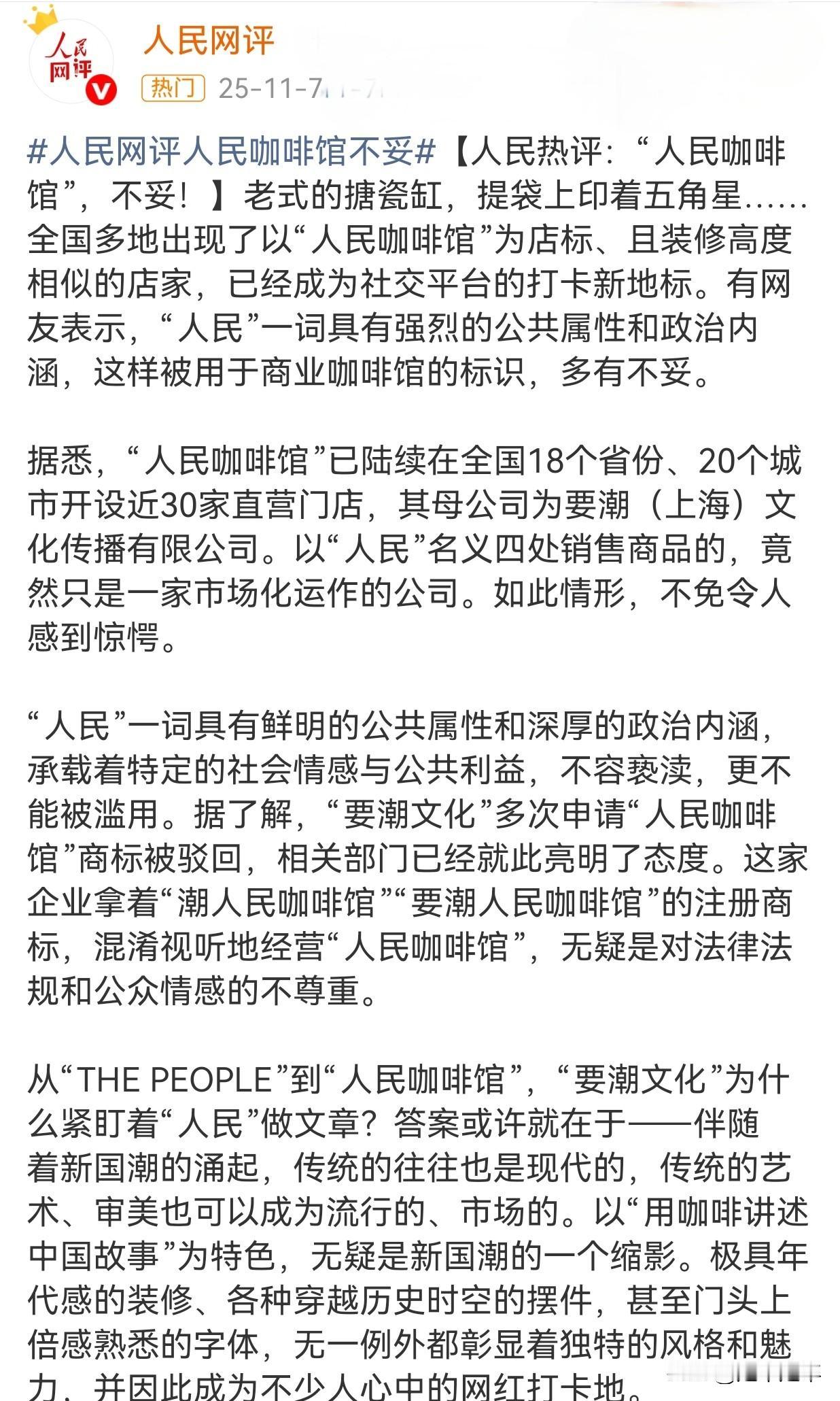 人民网评“人民咖啡馆不妥”!👍👍 人民网的主要观点是“人民”一词具有鲜明的公共属性和政治内涵,不能被商业滥用。这个词汇在我国语境中承载着特殊情感,比如“人民日报、人民医院”等机构名称中的人民代表公共利益。而这家咖啡馆的母公司[要潮文化]实际上注册的是“潮人民咖啡馆”商标,却故意隐去潮“字经营”,这属于典型的[挂羊头卖狗肉]行为。该品牌以“人民咖啡馆”为招牌,搭配红色主调、搪瓷缸、五角星等符号,易误导公众联想官方背景。 近期,全国18个省份、20个城市冒出近30家装修风格高度统一的“人民咖啡馆”。早在22年母公司是要潮(上海)文化传播有限公司,就多次申请“人民咖啡馆”商标,结果全被相关部门驳回,如今这种行为已经触碰了法律红线。根据《企业名称登记管理规定》,企业名称不能有违背公序良俗、可能让公众产生误解的情形,而“人民咖啡馆”显然符合这些禁止性规定。法律人士明确指出,这种未按核准商标使用、擅自简化名称误导公众的行为,市场监管部门可依法责令整改、通报罚款,若造成消费者误解,还需承担民事责任。 值得警惕的是,而是“噱头经济”的又一次变种。这些资本用噱头经济来运营,消费爱国情怀品牌以“用咖啡讲述中国故事”为口号,借红色元素包装“国潮”概念,部分门店客服甚至回怼差评“说咖啡不好喝就不是中国人”加剧了消费者的反感。 25年11月8号的信息,要潮人民咖啡馆宣布中国大陆门店统一更名为“要潮人民咖啡馆”,规范使用注册商标,整改线上线下物料,港澳及海外门店保留原名。可门店仅添加“要潮”二字,“人民咖啡馆”仍是视觉焦点,这不是换汤不换药?本质上仍是消费“人民”流量,必须彻底摒弃与“人民”相关元素。而且为何港澳及海外门店保留原名? 更需要注意的问题是,他多次想注册“人民咖啡馆”商标被驳回的。就注册了叫[潮人民咖啡馆]。可门头牌匾也是需要审的呀,他们是怎么批下来的?难道故技重施,又搞骚操作,上传的效果图也是个不一样的?因为从理论来说,你审报的商标和你的门头牌匾的效果图是必需一致的。不可能商标有个潮字,你传上去的门头牌匾没有这个字,还会给你过审的。他家还全国去开了18家连锁,他不是一家开在犄角旮旯的小店啊!如果是现在这样,注册商标和门头牌匾都不一致,还真有人给他过的,那这跟雪山那个事儿一样,基层公务员+管理的干部都应该受到处罚。