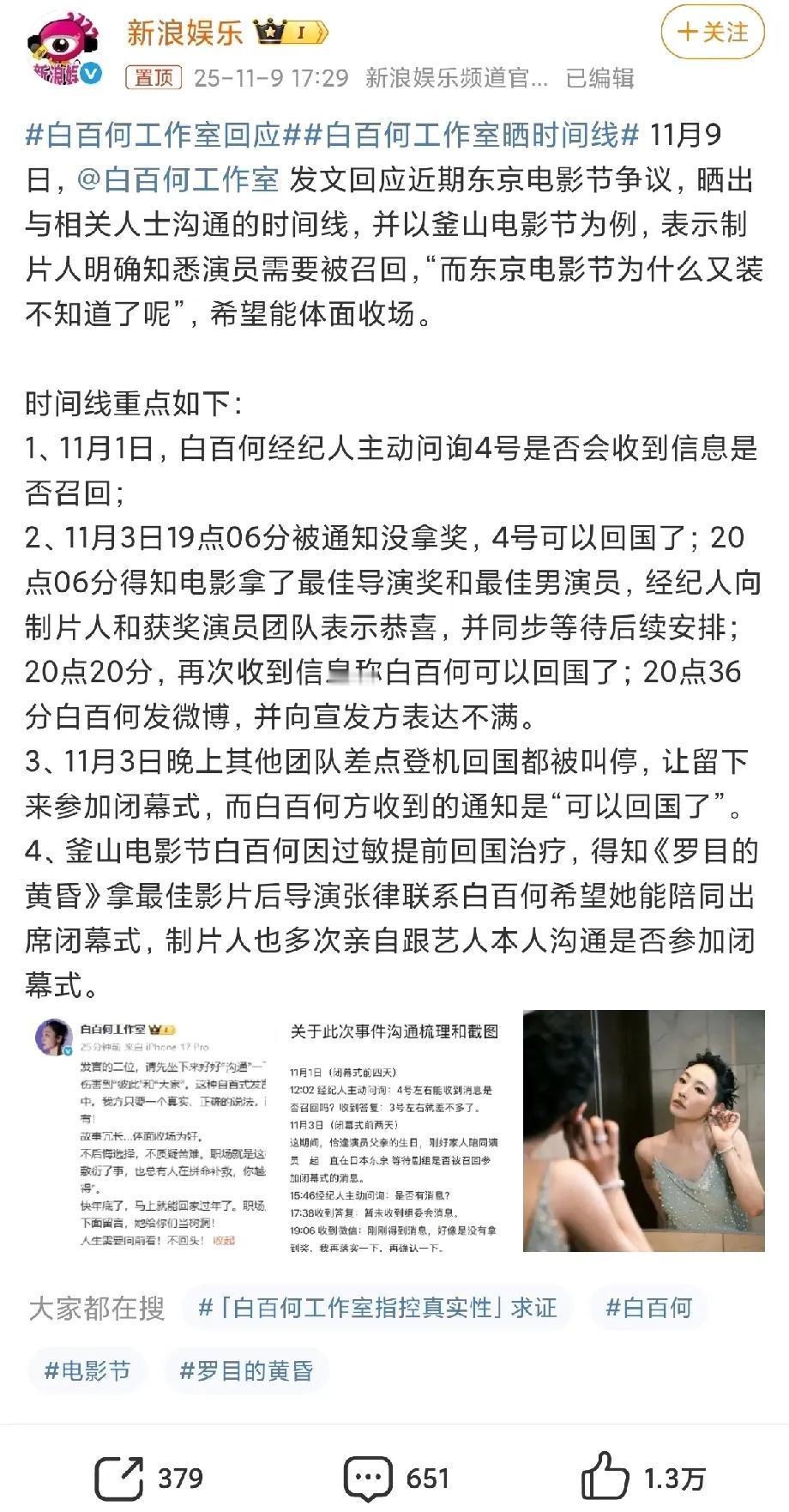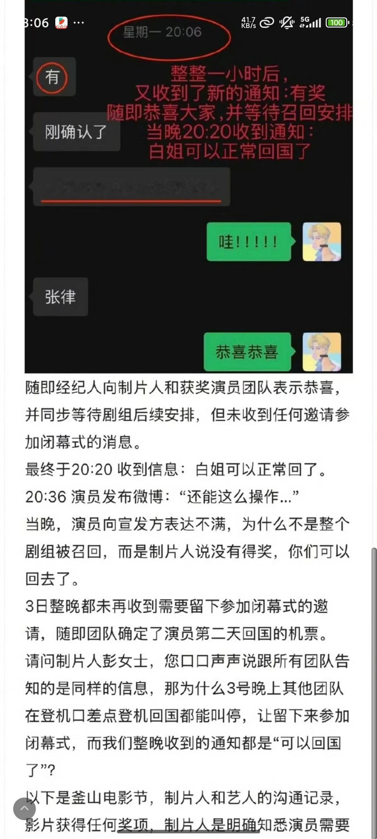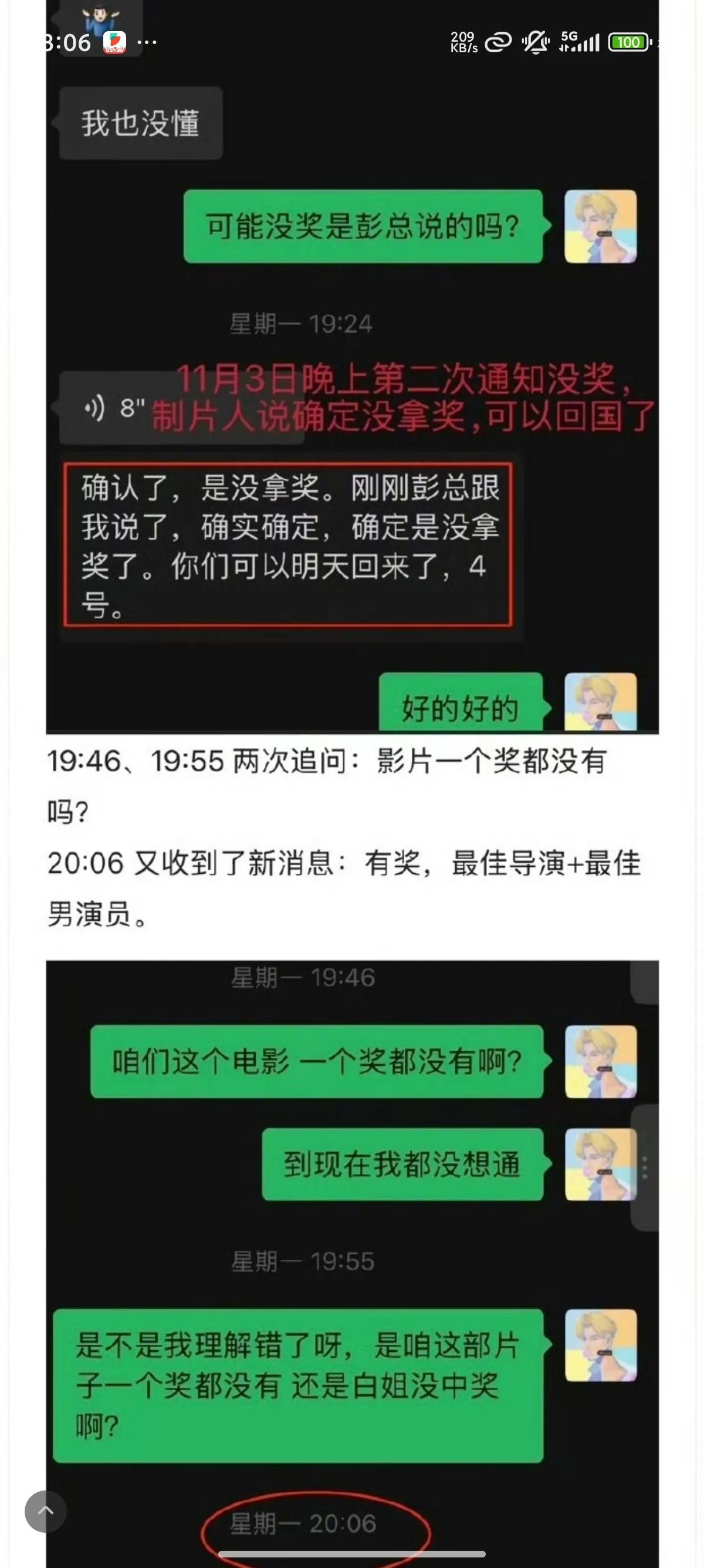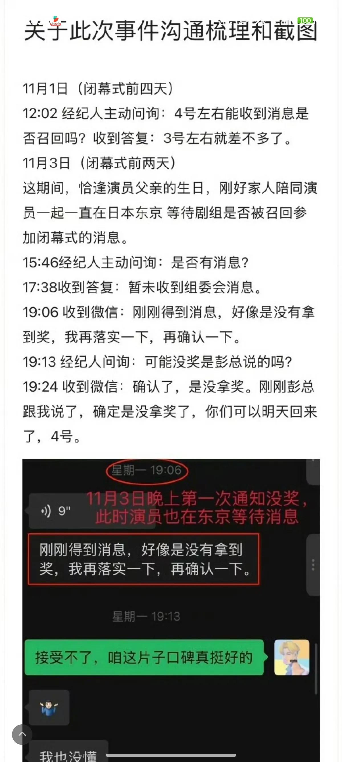有点刺激了!白百何放锤和时间线了 共锤三点,一锤了王传君一开始就知道要拿奖了,并不是男主领奖时说的事先不知道拿奖。 二锤了从韩国开始,拿奖就没跟白百合说,没带她。 三锤了东京拿奖全去,除了白百合,有点搞霸凌啊 所以釜山的时候,,结果东京身边有王传君,就把白百何扔了,用人朝前不用人朝后的做派挺恶心人的。 之前釜山的时候也是剧组得奖,导演狂call 白百何,百何都在飞机上了回北京了,彭狂打电话问她回不回来参加闭幕式,而原因是导演不想一个人走红毯 东京就变成剧组被召回的时候不搭理她了,不通知她走闭幕式,让她赶紧回国。 要是正儿八经拿奖,不管是最佳影片还是最佳男主,哪有不告诉另一位主演的道理? 感觉像是先把别人打发回去,免得留下在红毯上发难。凭实力拿奖,没那么说不出口吧。 导演和制片自己也说了在韩国白百合高高兴兴和她们打招呼再见,那回也拿奖了,白百合也没不高兴啊。 同样的事情,省略点细节,意味马上不一样了。 尤其还是在大女主电影里捧出个男影帝。
