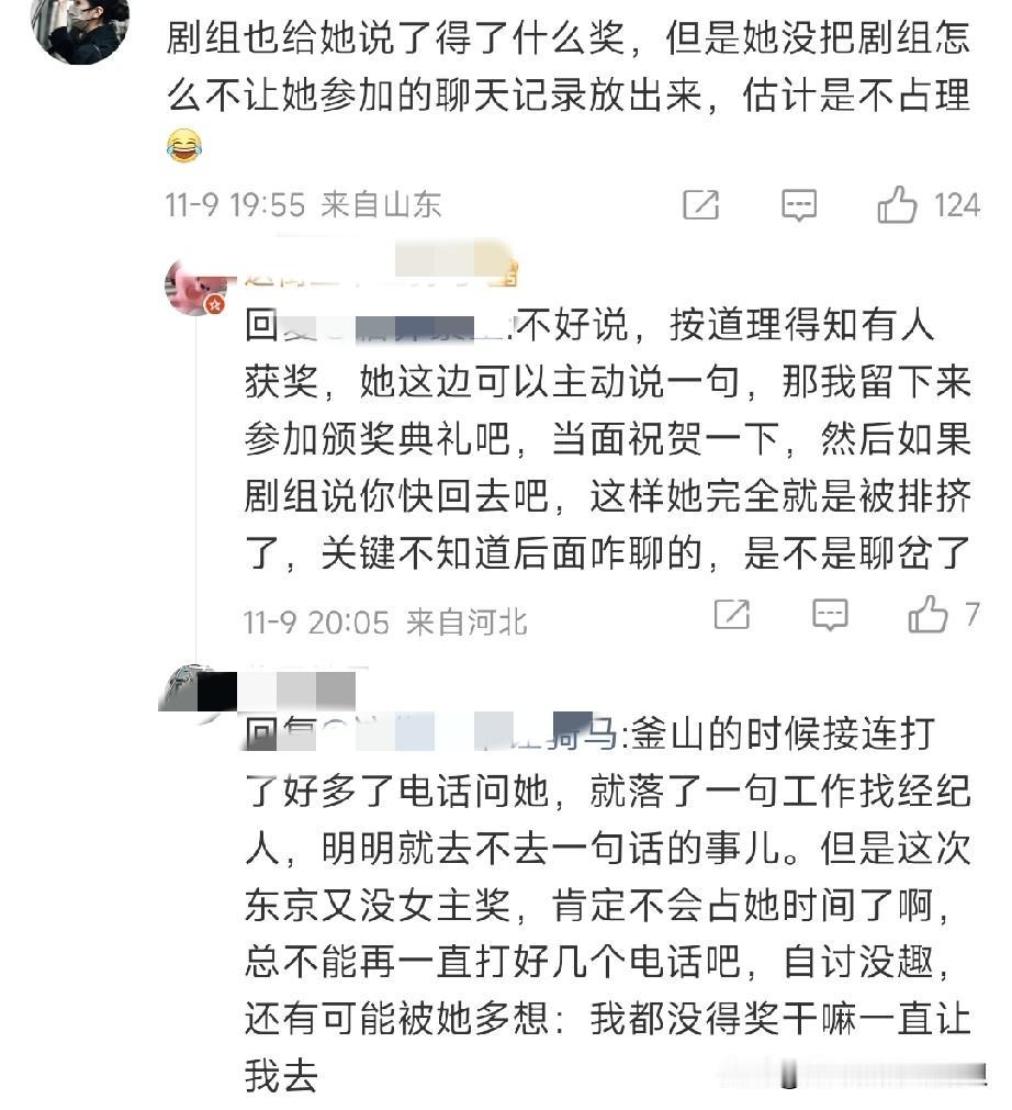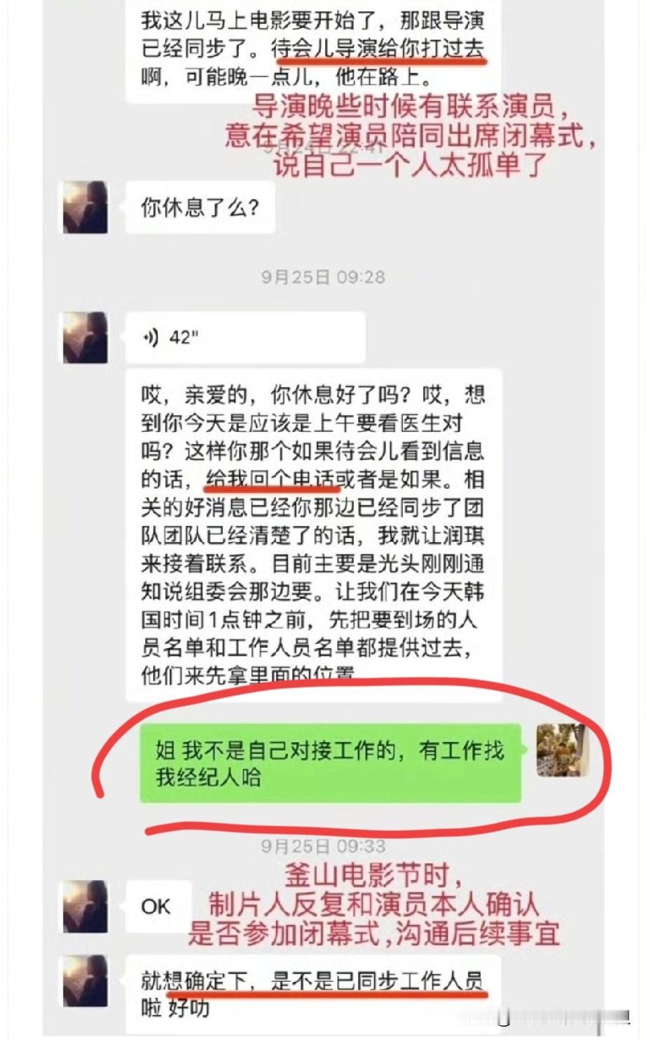 白百合工作室又回应了,但这次网友好像不站她了。 因为从白百合晒出的时间线来看,证明导演他们没有说谎。 8点20通知的,白百合可以回国了,因为没拿到影后奖。 至于为什么导演通知的是白百合经纪人,而不是她本人。 看图三就知道了。 釜山的时候,制片人跟她联系时,语气挺礼貌的,但是白小姐回复道, 「我不是自己对接工作,有事找我经纪人」 这次东京,人家第一时间通知到了白百合经纪人,结果她又搞这一出。 说实话,这样的演员真挺难合作的。