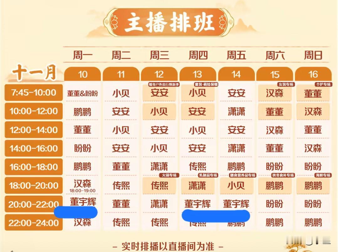 与辉同行新一周的排班表新鲜出炉 含辉量非常高,有3天的直播安排 现在感觉董宇辉在公司上播反而是休息 在外奔波、参加各种会议也太累了 今天看他的直播状态挺疲惫的 出差这几天完全是连轴转 三天时间上海-乌镇-北京跑 进博会直播+互联网大会演讲+双十一直播 这简直是特种兵的节奏[笑哭] 回北京还好点 最起码不用在路上消耗 下周结束应该就是安徽行了 期待新一轮的阅山河[耶]