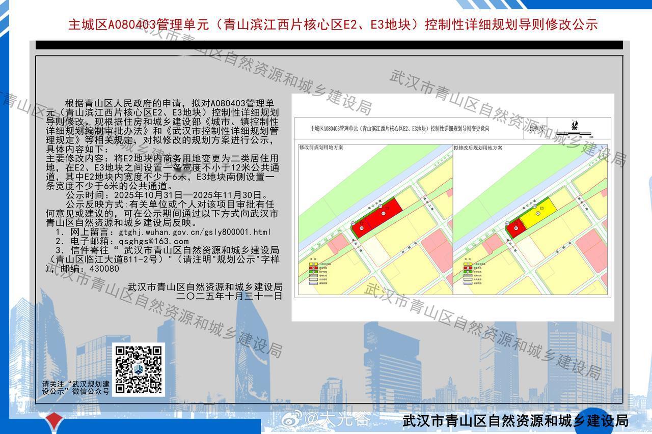 青山滨江商务地块已所剩无几,大部分已变更为住宅 10月31日,青山区自然资源和城乡建设局根据申请拟对A080403管理单元(青山滨江西片核心区E2、E3地块)控制性详细规划导则修改。将E2地块内商务用地变更为二类居住用地,在E2、E3地块之间设置一条宽度不小于12米公共通道,其中E2地块内宽度不少于6米,E3地块南侧设置一条宽度不少于6米的公共通道。