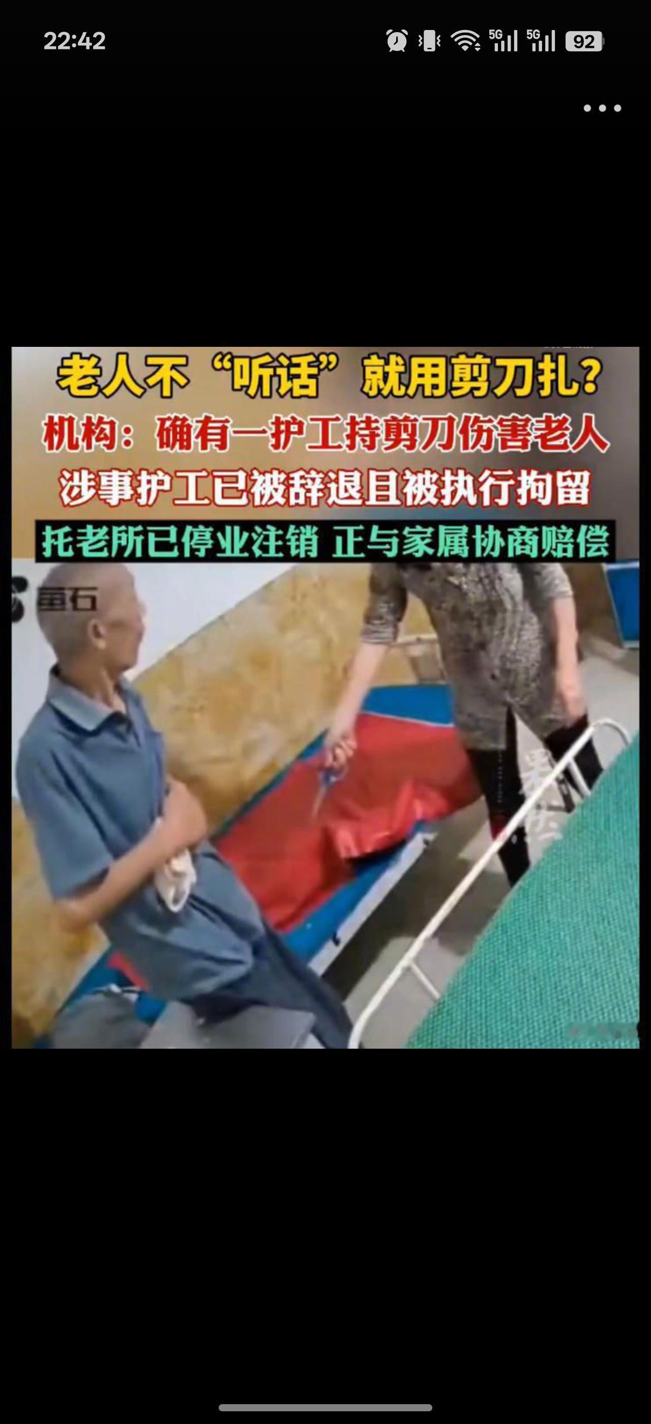 老人不听话,咋办? 黑龙江这家养老院护工,处理就很简单,直接用剪刀扎,这样粗暴的行为,没一人告诉家属。 直到3天后,手化脓后才知道。9发生的事情。现在才上新闻,就说明家属对于养老院处理很不满了。 据记者采访养老所负责人,相关赔偿还在协商中,并且养老所也已经申请注销。 养老机构的事情屡禁不止,并且所有的虐待老人都是家属发现的,养老院的规章制度何在呢,相关单位的监管何在呢?
