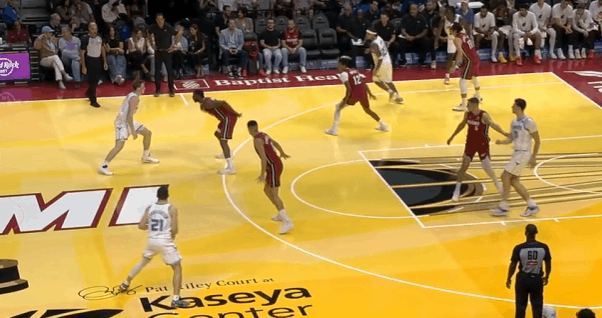 图4“WTF/INDIANA”战术比较常见的使用场景是边线球回合,黄蜂这是暂停回来的ATO,所以他们以曼持球推过半场后和瑞安在强侧的“Pistol”为起手式,衔接弱侧的“WTF“。