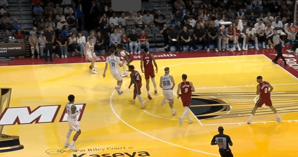 图8和上个回合同样的战术,这个回合克尼普尔选择借助瑞安的掩护延阻威金斯,随后直接持球投打击弱延误的韦尔。
