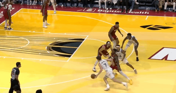 图1持球推过半场抓早攻阶段直接左路突米切尔,米切尔先是横移对抗没能逼停克尼普尔,后者靠着节奏突到近框后一记小抛投躲避篮下的韦尔。