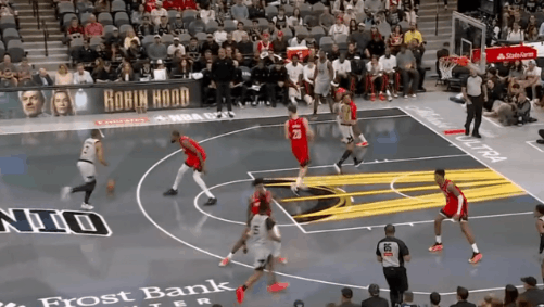 图1无球状态下对抗、卡下盘、绕前防接球,在巴恩斯给文班传球的瞬间“鱼跃”与阿门合力将球破坏。