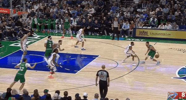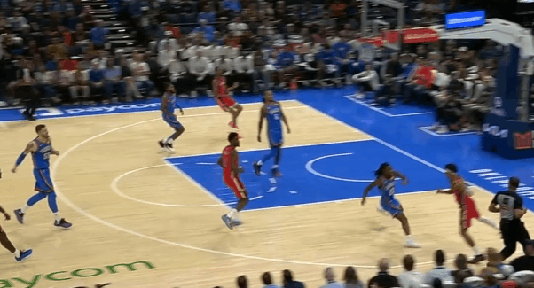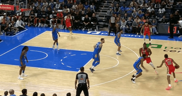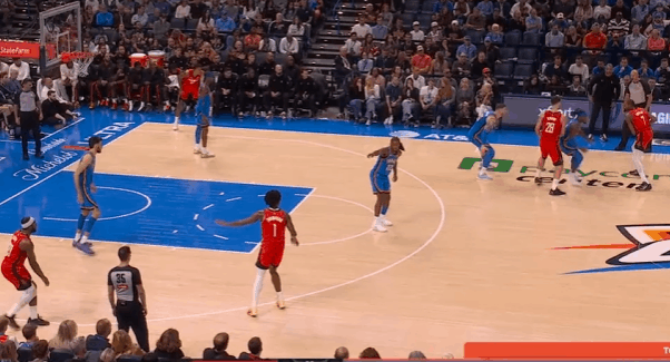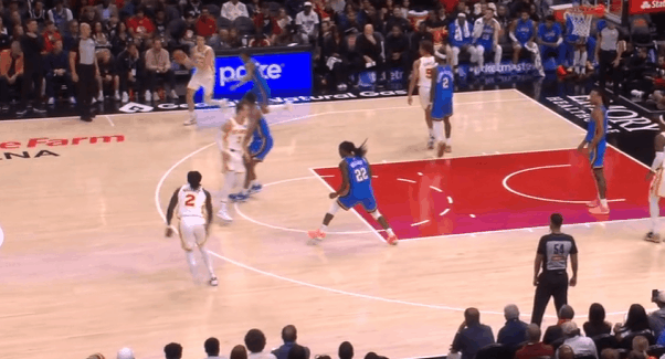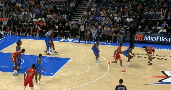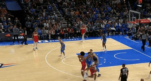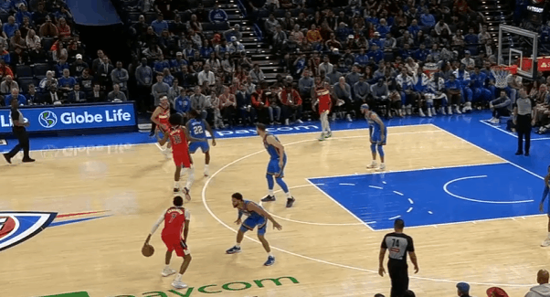 图2对位阿门,直接站刷卡位守“单人联防”,先是诱导杜兰特出球给弱侧,随即立即破坏传球。