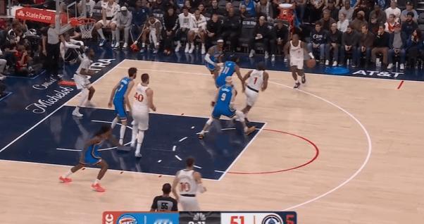 图6意识到基斯伯特要无球起手立即无球压迫、双手控制,抢过掩护后先是高举双手避免球传给顺下的巴格利,在基斯伯特向下沉球的一瞬间又立即顺着惯性向下将球拍掉。