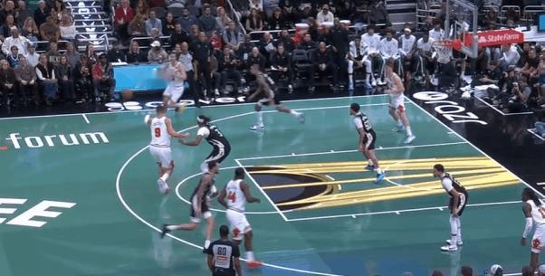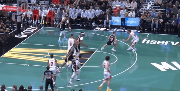 图8持球推过半场随即衔接与武器的挡拆配合,特伦特走下线绕防、库兹马高位沉退,吉迪胯下拉回佯装衔接持球投,吸引库兹马上提、特伦特防守注意力,随后立即反吊顺下面对特伦特抢出身位优势的武器。
