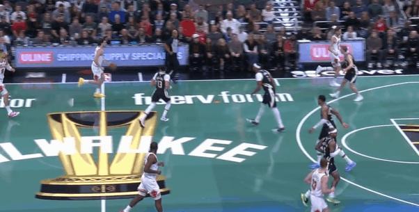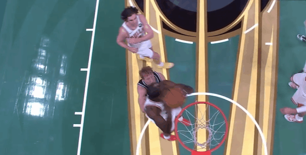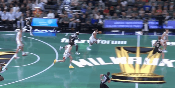 图6快攻跟进前场3打2,接到琼斯传球吸引格林防守注意力后传给最前方的赫尔特。