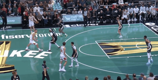 图2布泽利斯佯装借助武器的“Away Screen”上提,实则反跑空切篮下,武器站在弧顶也把特纳调出了篮下,吉迪人到球到助攻布泽利斯空切得手。