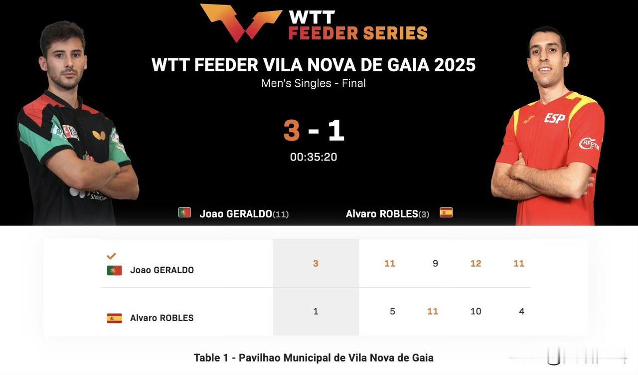 男单决赛:11.9 若奥·格拉尔多🇵🇹3-1阿尔瓦罗·罗伯勒斯🇪🇸【11-5,9-11,12-10,11-4】 若奥·格拉尔多🇵🇹获得WTT支线赛加亚新城站男单冠军🥇🎉 阿尔瓦罗·罗伯勒斯🇪🇸获得WTT支线赛加亚新城站男单亚军🥈 ​​​