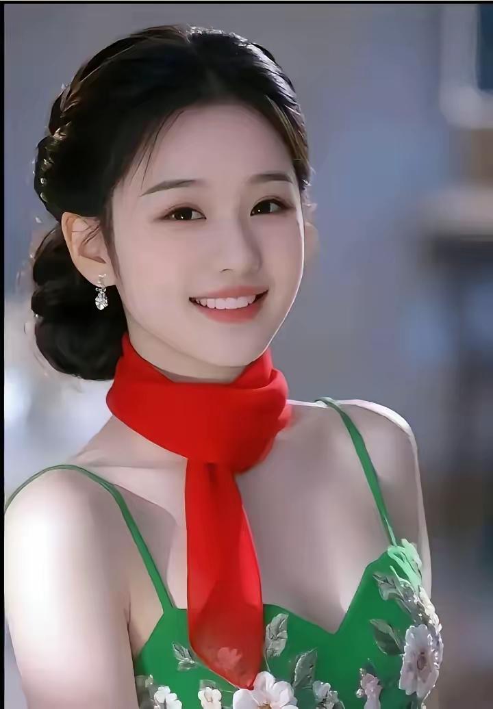 甜美微笑,红丝巾点缀,花裙飘逸,优雅动人。
