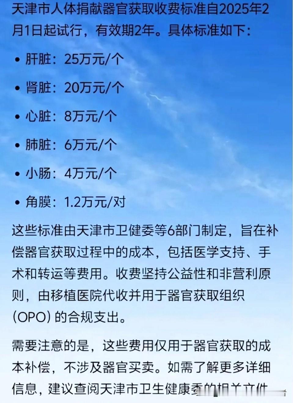2025年1月,天津市卫生健康委、天津市发改委等6部门印发了《天津市人体捐献器官获取收费和财务管理实施细则(试行)》,自2025年2月1日起正式实施 。 该细则明确了捐献器官获取收费标准按照捐献器官类型分别制定,其中肝脏25万元/个,肾脏20万元/个,心脏8万元/个,肺脏6万元/个,小肠4万元/对,角膜1.2万元/对。 这些费用主要用于弥补人体器官获取组织(OPO)获取捐献器官的成本,包括捐献者医学支持、遗体修复及善后、器官获取手术、器官转运等多项成本 。 天津这个器官获取收费标准化的政策太赞了!一开始看到定价还纳闷,后来才懂根本不是买卖器官,全是合理的基础成本。 以前总对这类费用糊里糊涂,容易瞎猜,现在官方把体检、手术这些收费项说清楚,还强调捐献者和接受者费用一致,真的特别透明。公益不是零成本,规范收费反而能避免乱象,让捐献者家属放心,也让受赠者安心。 这种把账算明白、把规则讲清楚的做法,才能消除大家的顾虑,让生命接力的通道更顺畅。为这种守护公益又接地气的政策点赞,希望能让更多人理解支持器官捐献! 各位读者友友们,大家对此事有何看法?欢迎评论区留言讨论!